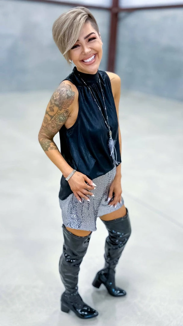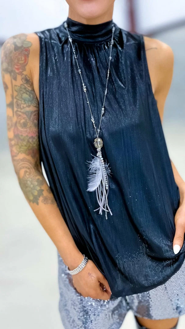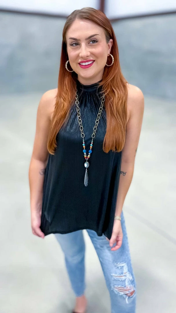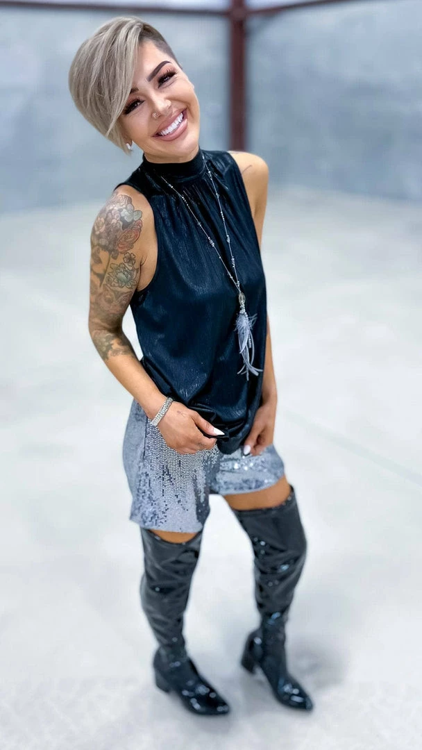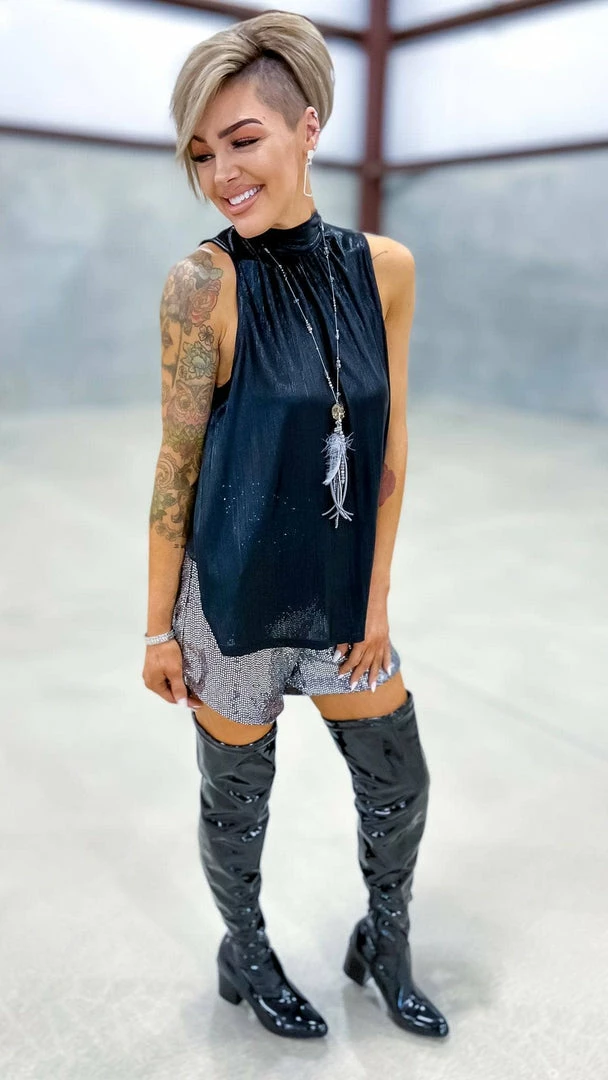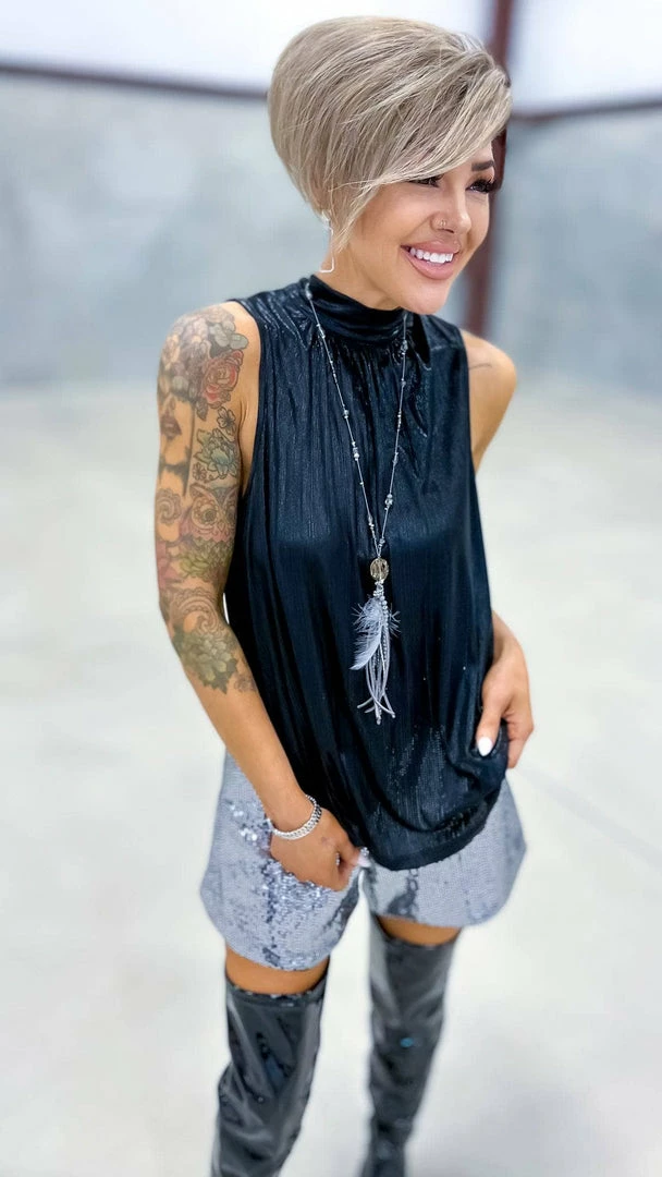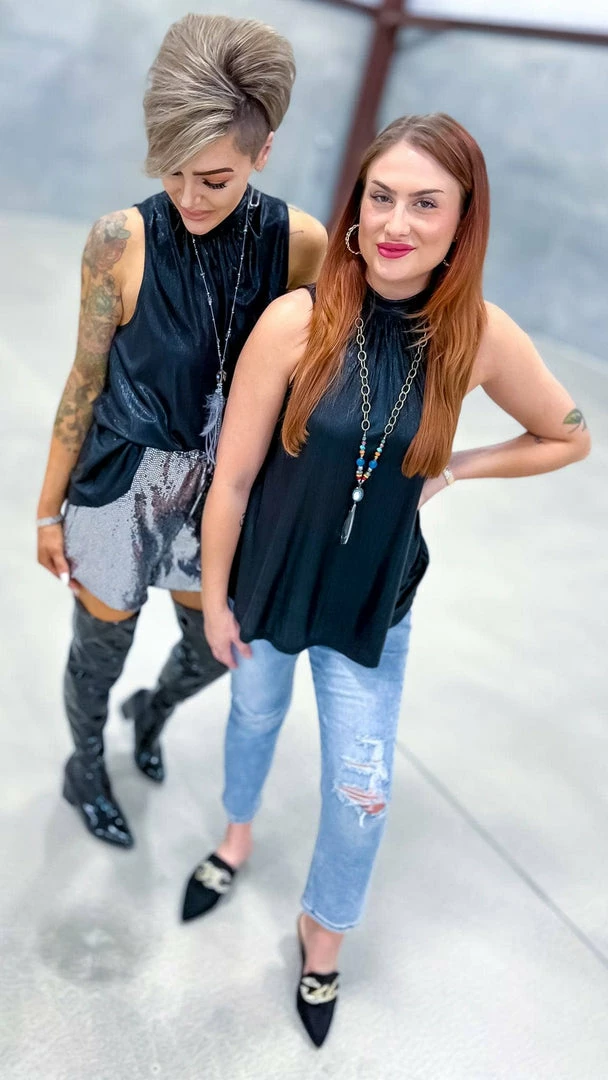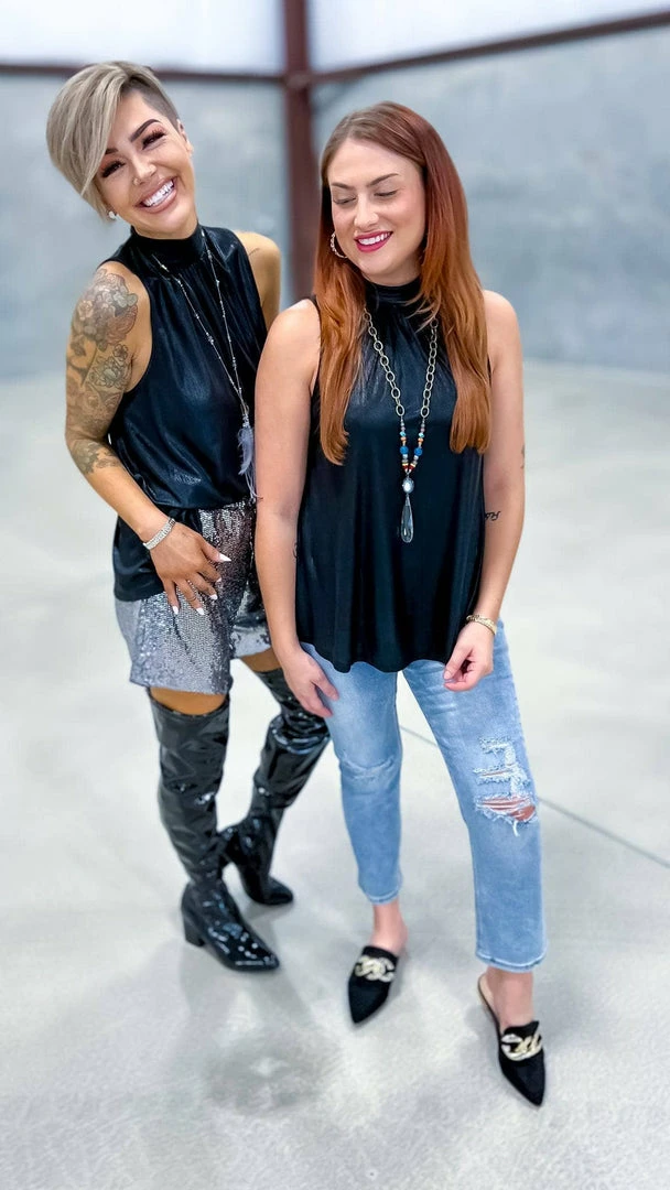 The perfect top for your next night out. With its elegant and stylish design, this black top is sure to turn heads. With a halter neckline and delicate straps, it adds a touch of sophistication to any look. Pair it with a skirt or jeans for a night on the town.
