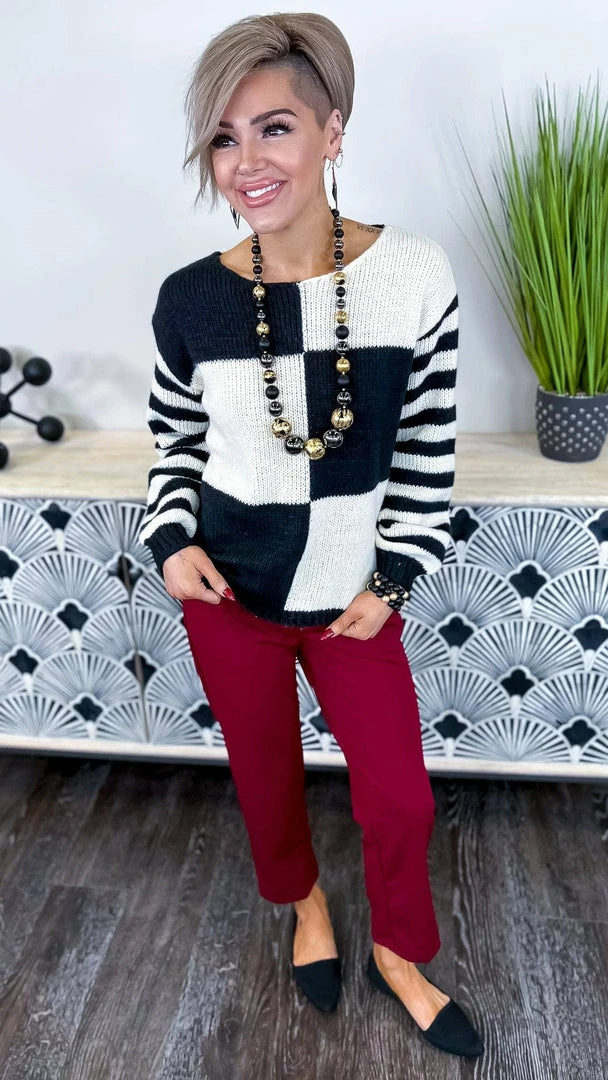 The definition of coziness, the Ski Bum Sweater is your new favorite piece for those chilly winter days. With a soft construction and large colorblock, this sweater is perfect for lounging around the house or running errands. The striped sleeves add a touch of fun and femininity to this piece. Whether you’re layering it over a long sleeve tee or wearing it on its own, the Ski Bum Sweater is sure to keep you feeling warm all winter long.