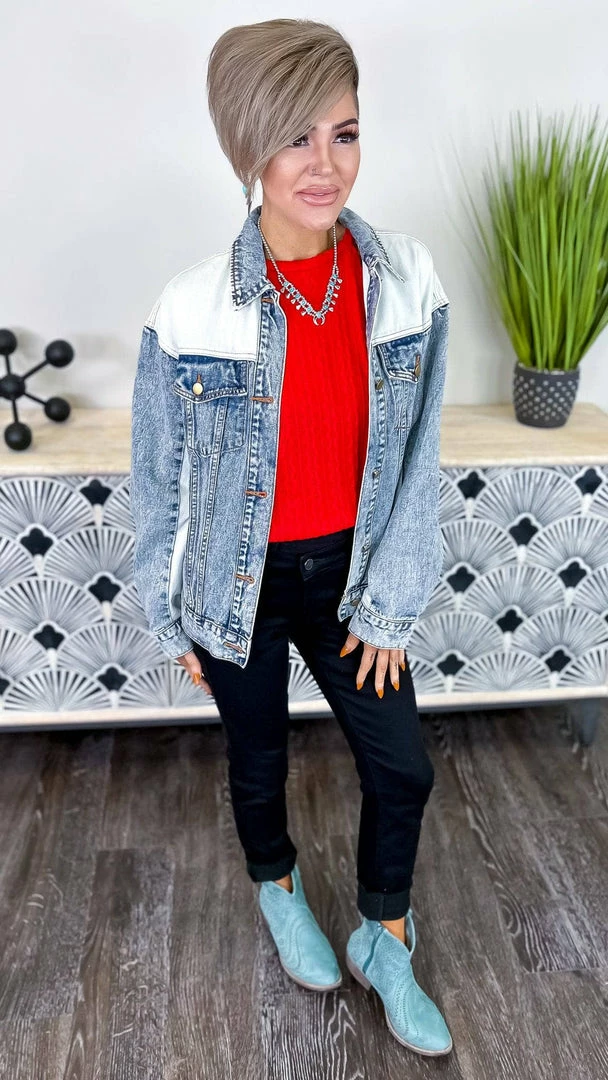 A little bit of 70s style is just what your wardrobe needs. This jacket has that cool, retro vibe that you love. With a two-tone wash and light distressing, it gives any outfit a touch of vintage style. Layer it over a dress or shirt and jeans for a stylishly cool look.