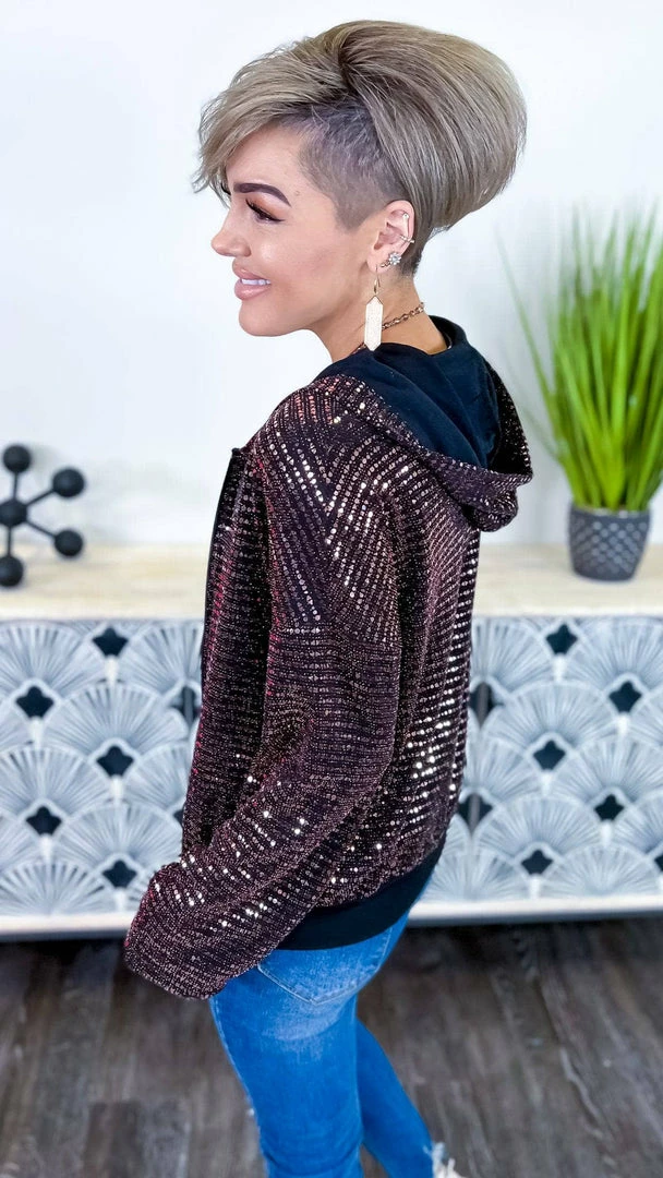 The Gold Magic of Midnight Jacket is a truly stunning piece. This jacket is covered in black and gold sequins that are sure to turn heads. The zip-up closure ensures that you can get the perfect fit. Whether you’re wearing it for a night out or a special event, you’re sure to make a statement in this jacket.