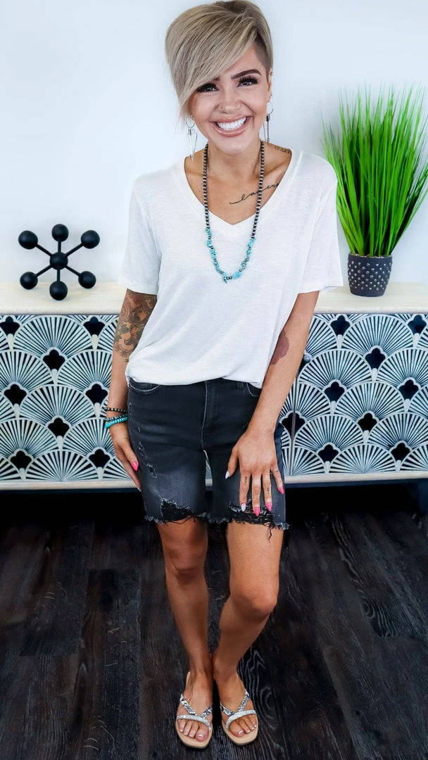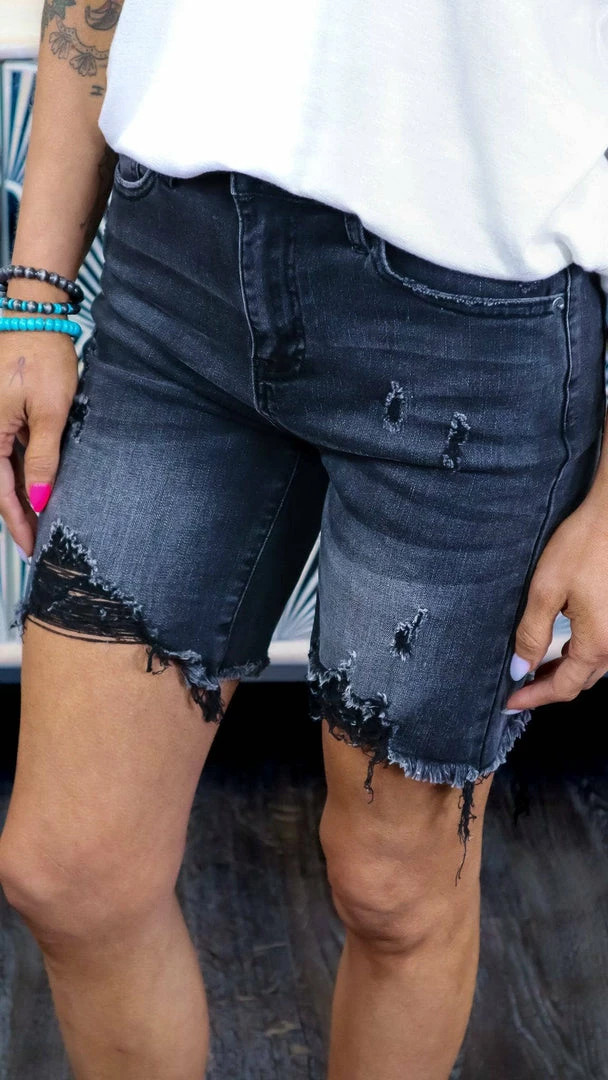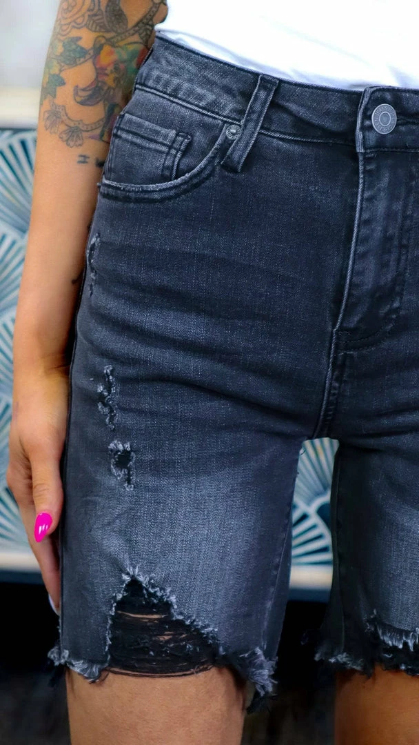 Style: High Rise Distressed Long Shorts