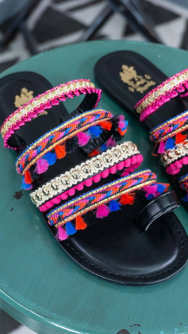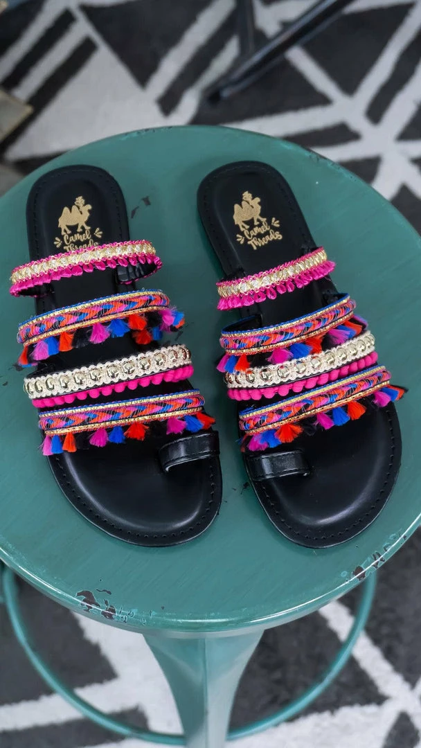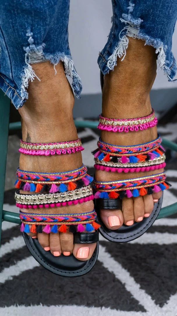 These bohemian slides are perfect for your summertime strolls. With a multicolor design, these sandals add a pop of personality to any outfit. The slides are also comfortable and easy to slip on, making them perfect for a day spent exploring.