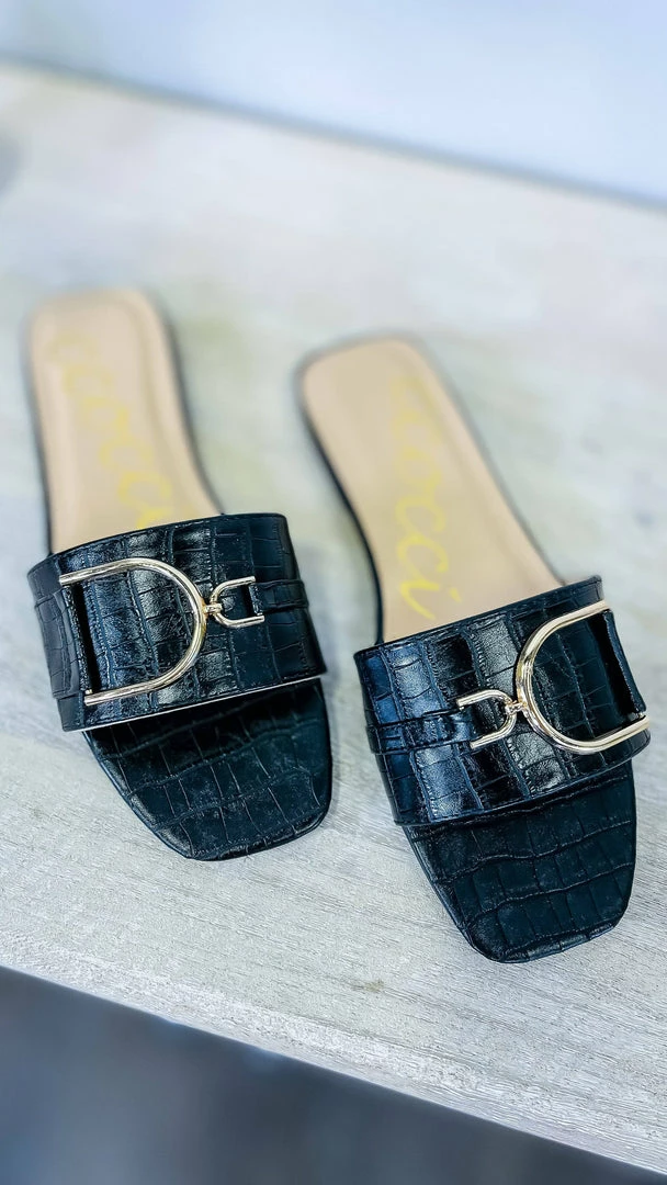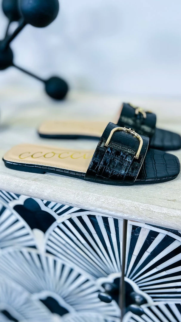 Elevate your style game with these faux croc sandals. These versatile sandals will take you from day to night in style. A sleek silhouette with chain detailing makes these shoes a must-have for your wardrobe. With a versatile design and luxurious faux crocodile leather, these sandals are perfect for any outfit.