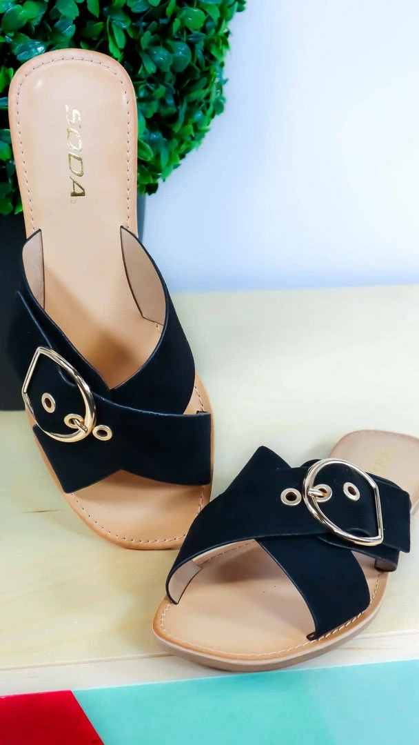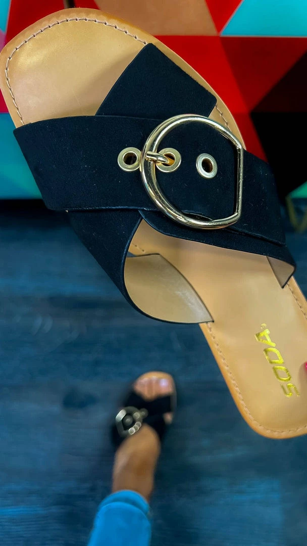 Shine on, summer nights. With sexy over-the-foot straps and dazzling gold ring details, these black slip-on sandals are sure to elevate any look. We love their versatile styleβperfect for a night out or a day by the pool. With a versatile style and luxe details, these sandals are sure to make an impression. Add them to your wardrobe and step into the season in style.