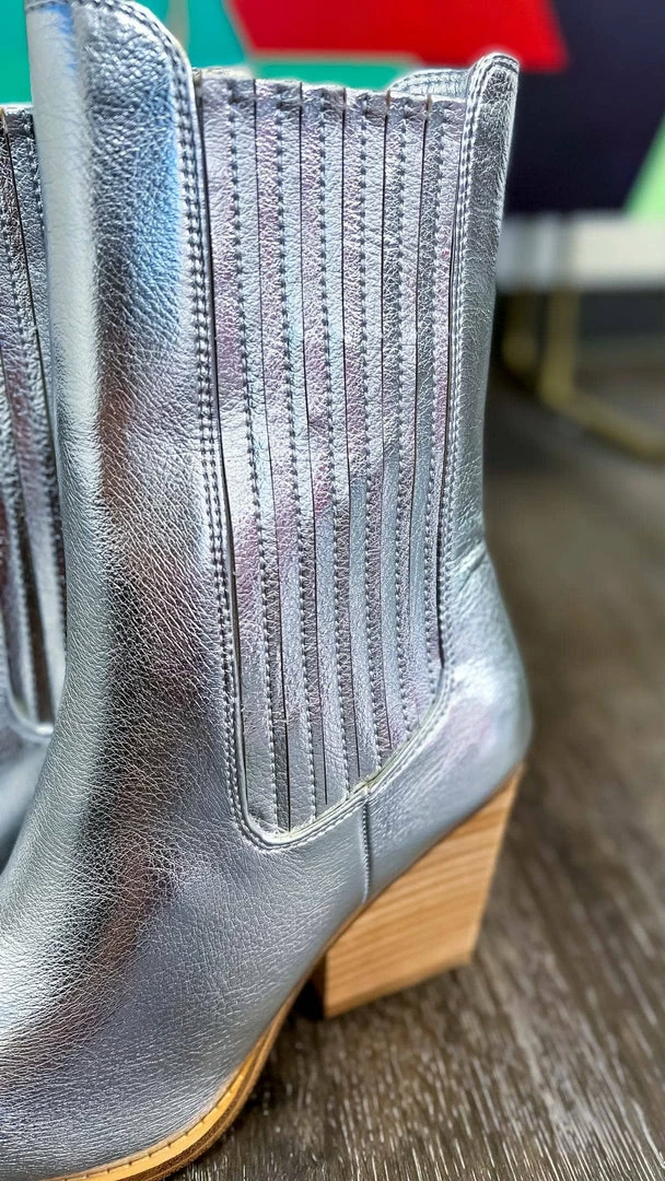 These metallic silver booties are sure to turn heads. With a metallic finish and a heel, these booties are perfect for a night out on the town. With a comfortable fit and a stylish design, these booties are a must-have for any fashion-savvy woman.