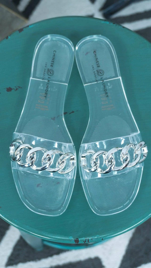 These oh-so-cute clear sandals feature a silver buckle atop the strap. These are an easy-on slide sandal.Β