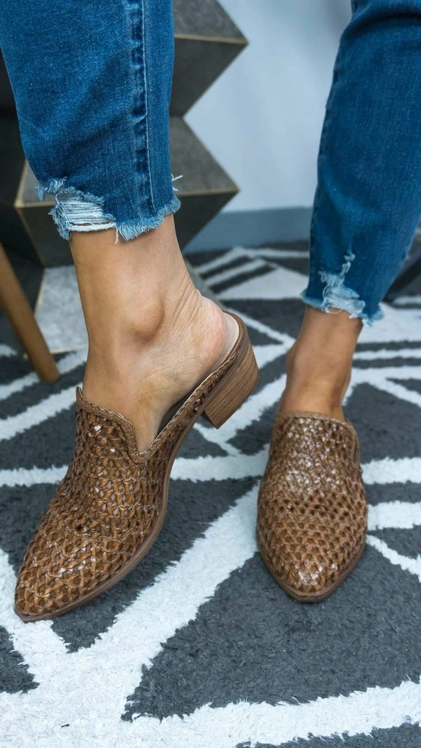 These trendy mules feature a woven, wicker-style pattern that is super chic & cute!Β