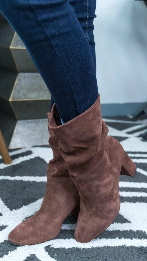 These brown mid-calf booties are made with real suede and bring such a chic vibe to any outfit. These boots feature real suede, chunky heels and a ruched look. Snag this classic pair today!
