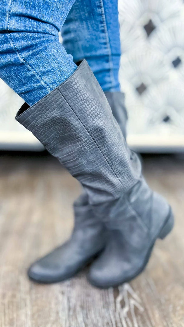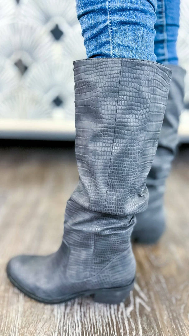 Take your fall wardrobe up a notch by adding these tall boots! These boots feature a soft croc pattern, slouchy fit, and block heel. The comfort level on these boots will allow you toΒ beΒ dressed up all day long!Β