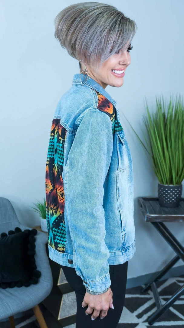 You know here at ZZS we like to bring you unique denim jackets that turn heads! This jacket features light wash denim, side pockets, functioning buttons, and a beautiful Aztec fabric on the shoulders and back.Β