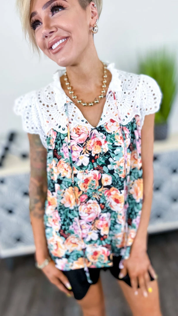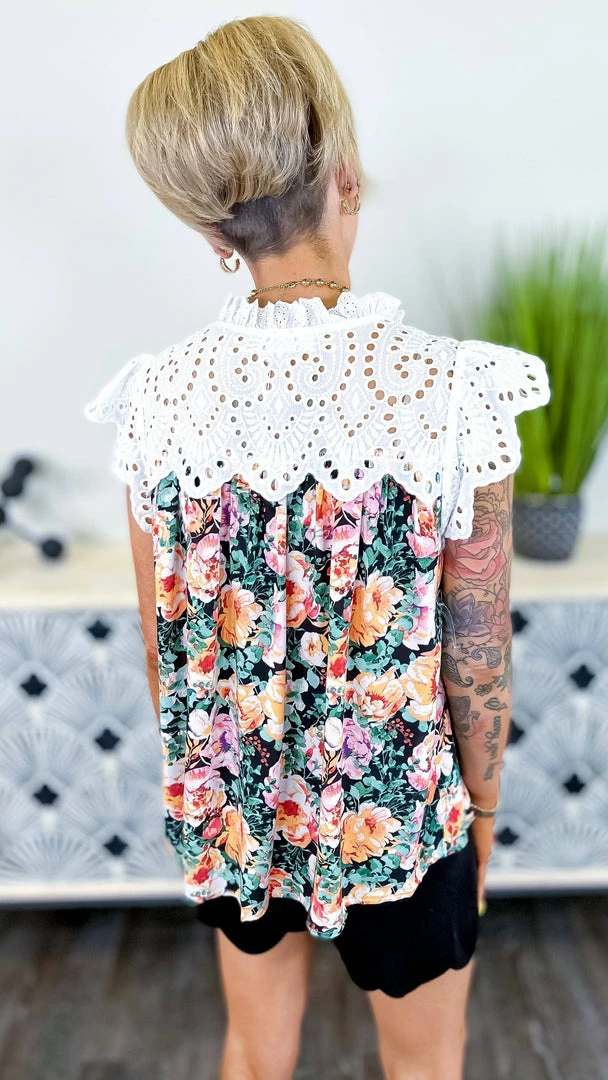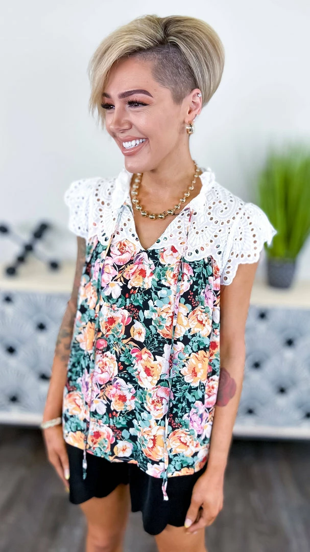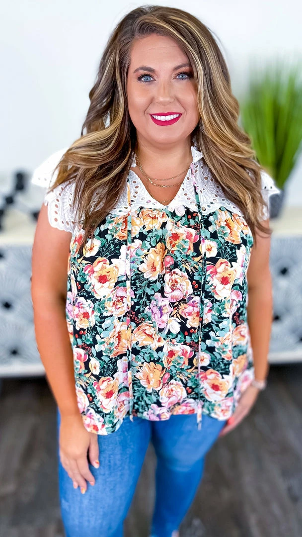 Fall in love with this beautiful floral print top with lace contrast detail. Brunch with the girls is where I will be wearing mine!