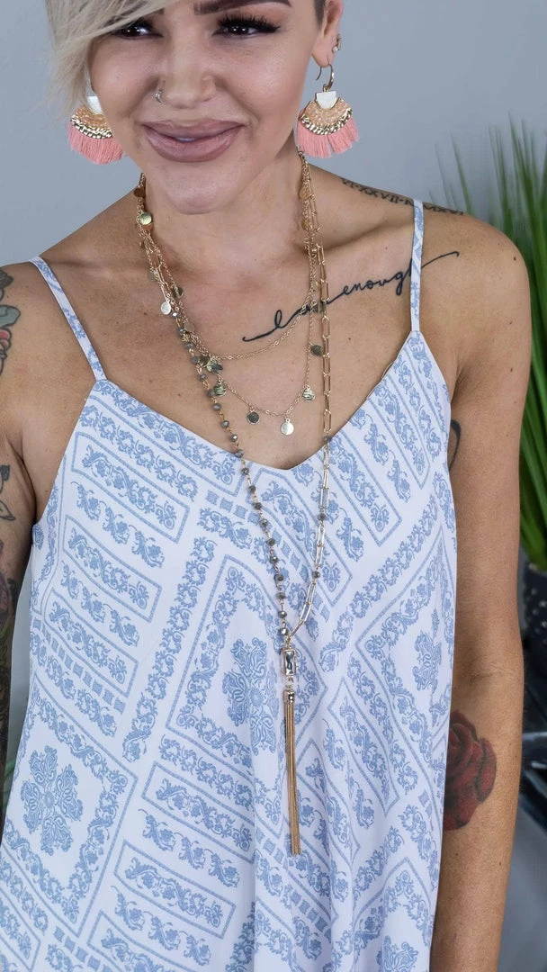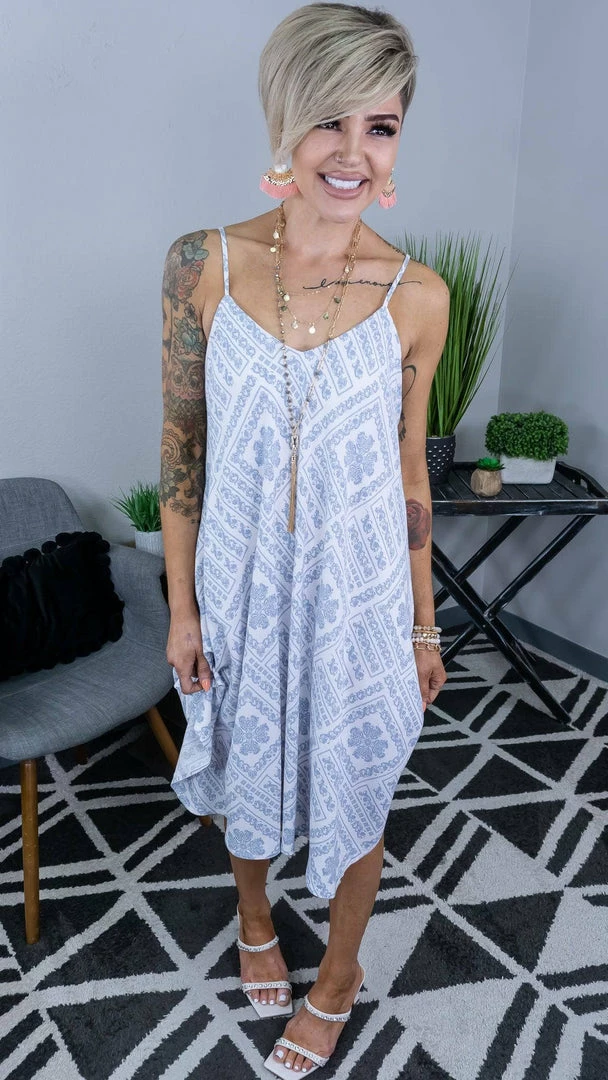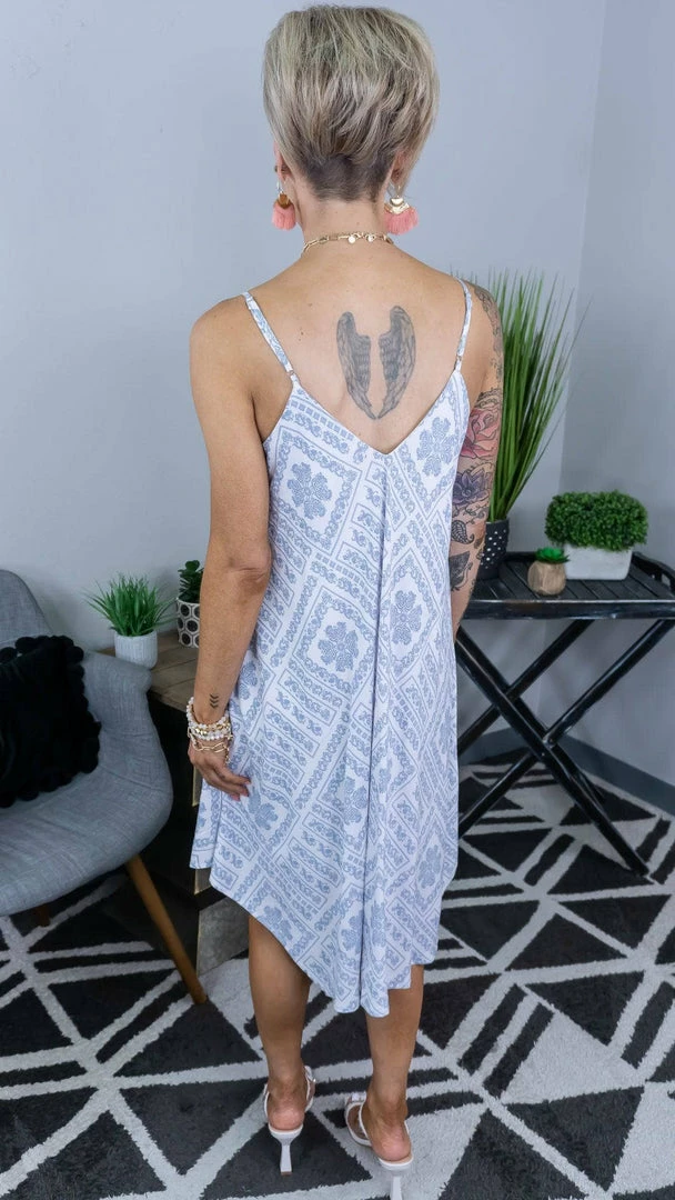 This dress is ready for this spring/summer look! We love this unique print all over the dress with v neckline and hanky hemline. So stylish, trendy, and unique. Non sheer, lined.