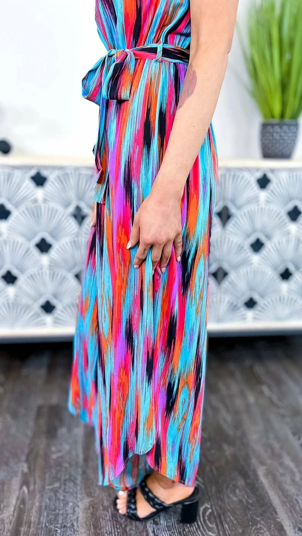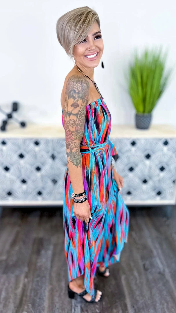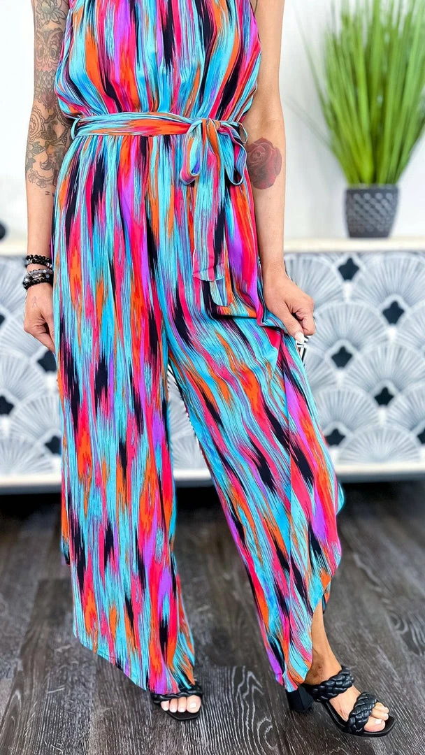 Looking for something fun and flirty for your next party or special event? This jumpsuit is perfect! With a fun and colorful print, it’s sure to make a statement. The waist tie detail helps to define your figure and create a feminine silhouette. With its comfortable and relaxed fit, this jumpsuit is perfect for any occasion.