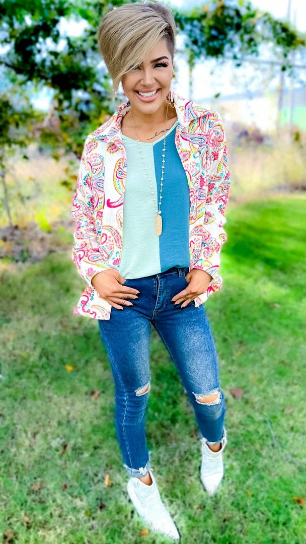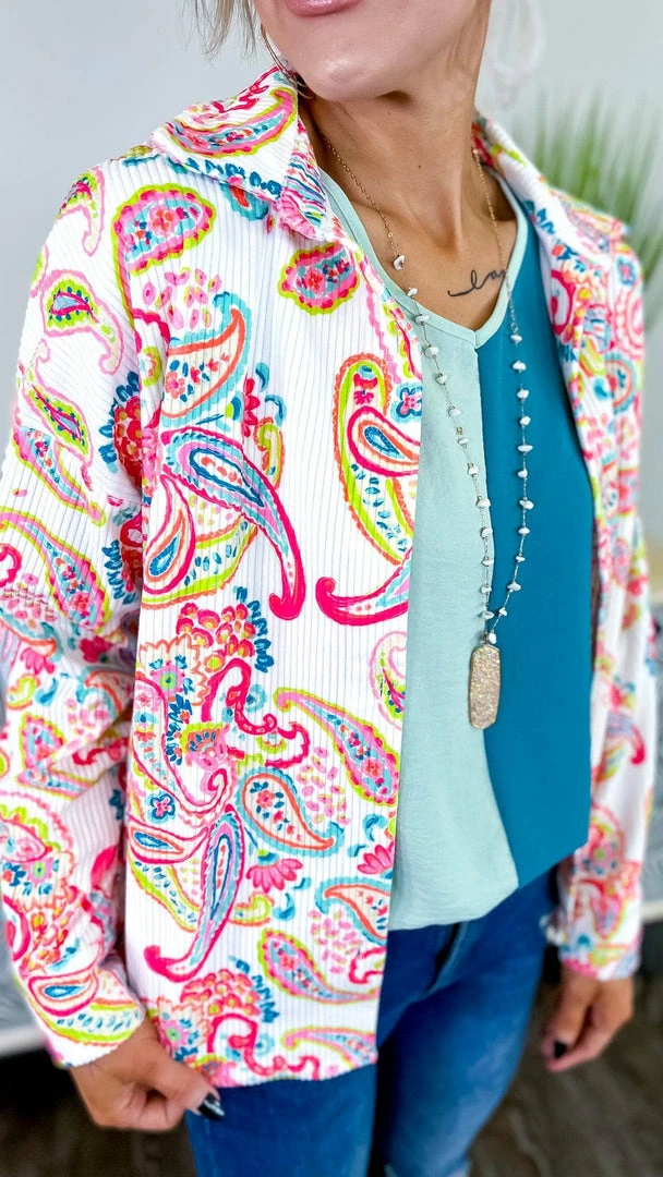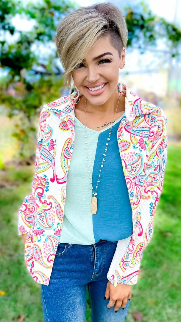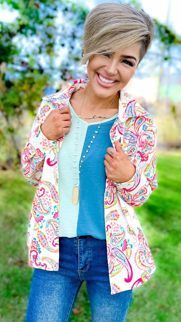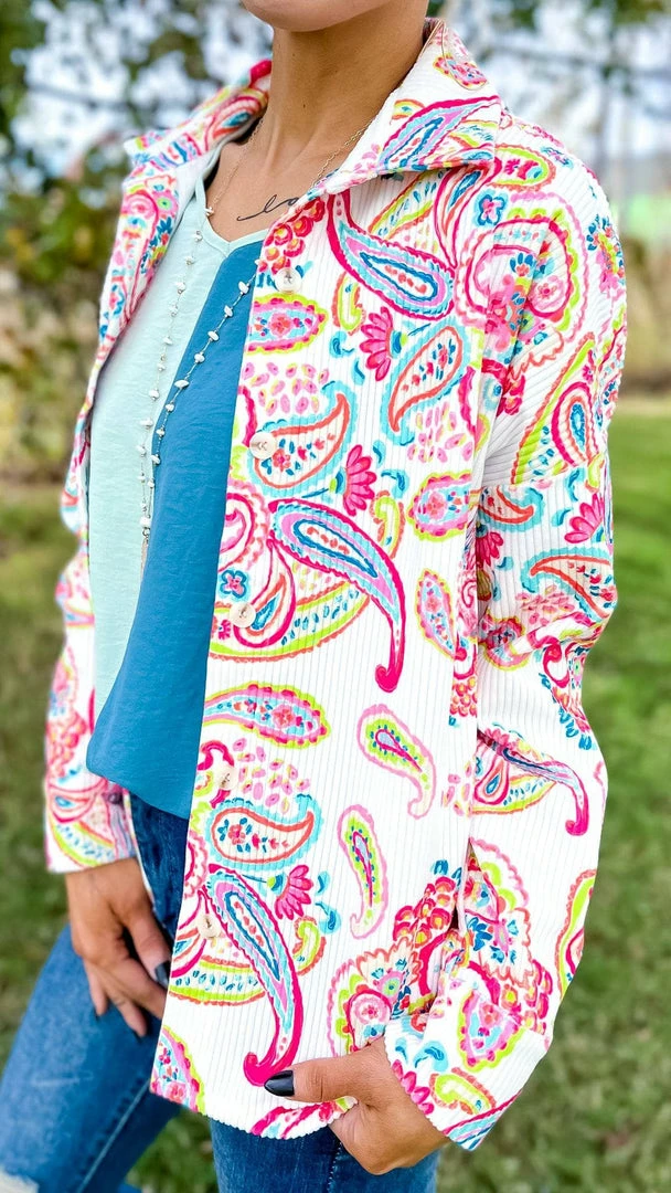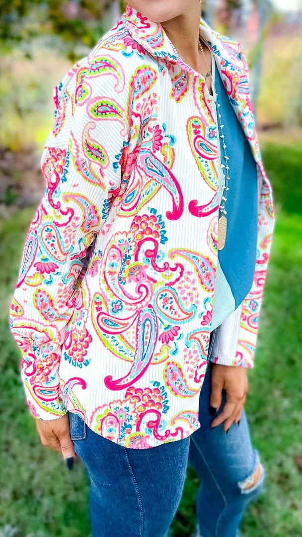 Layer it on! The Extra Magic shacket is here to take your style up a notch. With its Paisley print and soft corduroy fabric, this shacket is perfect for giving your outfits a touch of luxury. With its long sleeves and relaxed fit, this shacket is ideal for any weather.