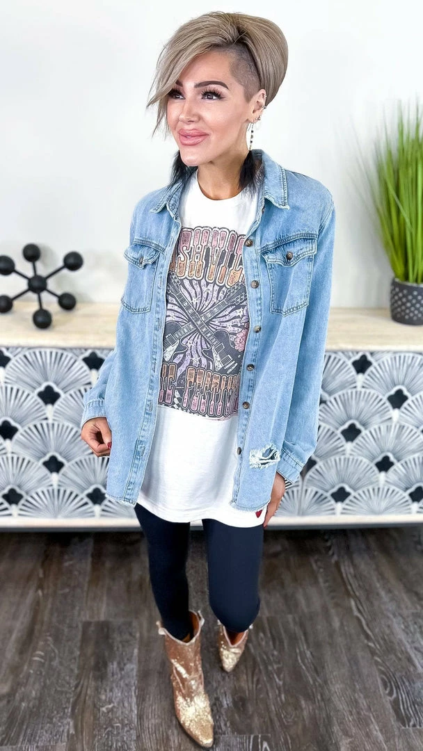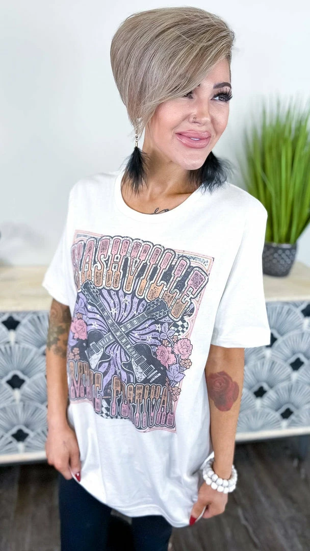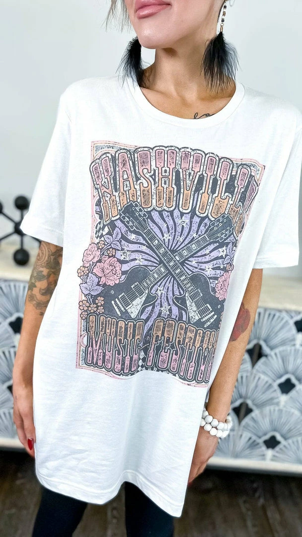 Sing your heart out at the Nashville Music Festival in this adorable tee! Music is everything, and nothing screams Nashville like a good old-fashioned music festival. This oversized short-sleeve tee is perfect for summer days spent listening to your favorite bands and eating delicious BBQ. With a cute and playful graphic, this tee is sure to become your go-to for festival season.