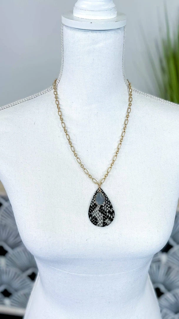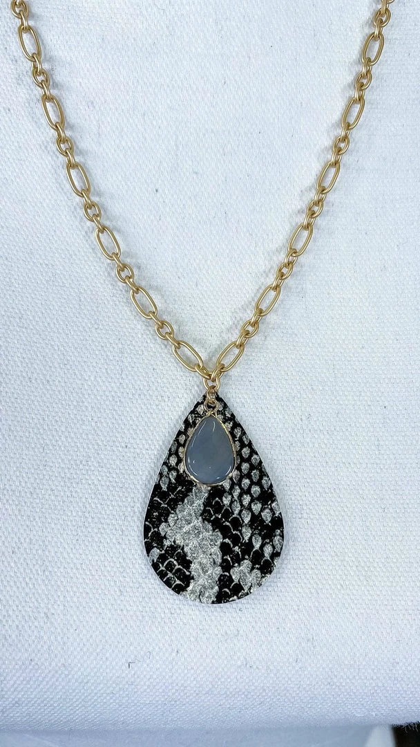 What a subtle and stunning way to add a pop of snake print into your outfit! This necklace features a gold chain, teardrop snake pendant, and overlaid gemstone.Β