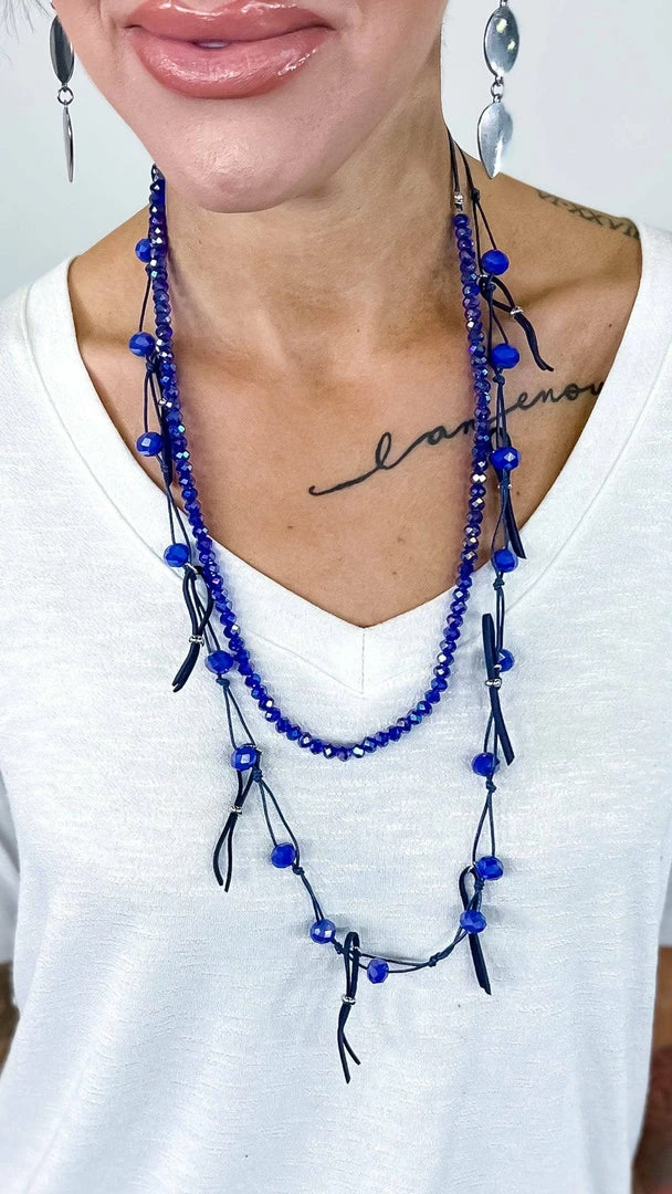The perfect touch of bohemian glam. A little bit gypsy, a little bit rock and roll, this necklace is a true statement piece. The long leather strand is adorned with beautifulΒ navyΒ beading, giving it a luxe and feminine look. The perfect finishing touch to any outfit, this necklace is a must-have for any fashion-savvy girl.