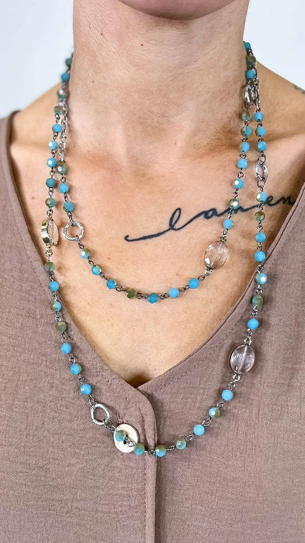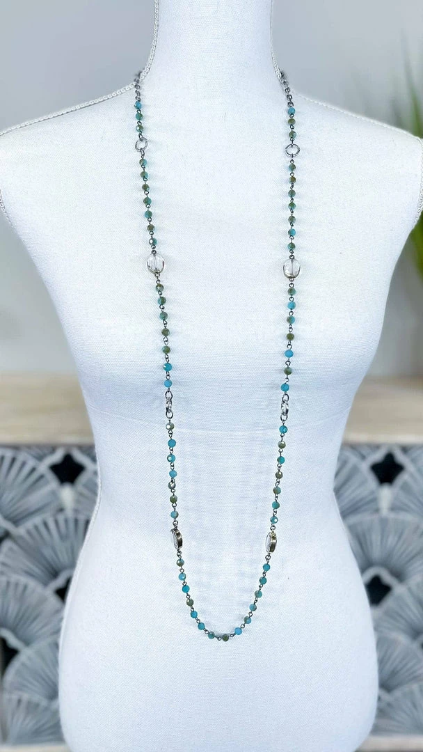 This turquoise necklace is the perfect addition to your jewelry collection. A long beaded chain with delicate turquoise beads, this necklace is perfect for everyday wear. The light color makes it easy to pair with other pieces, and the unique design is sure to turn heads. With its pretty details and versatile style, this necklace is a must-have for any fashion-savvy woman.