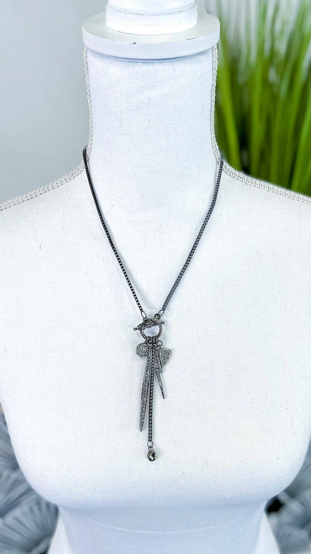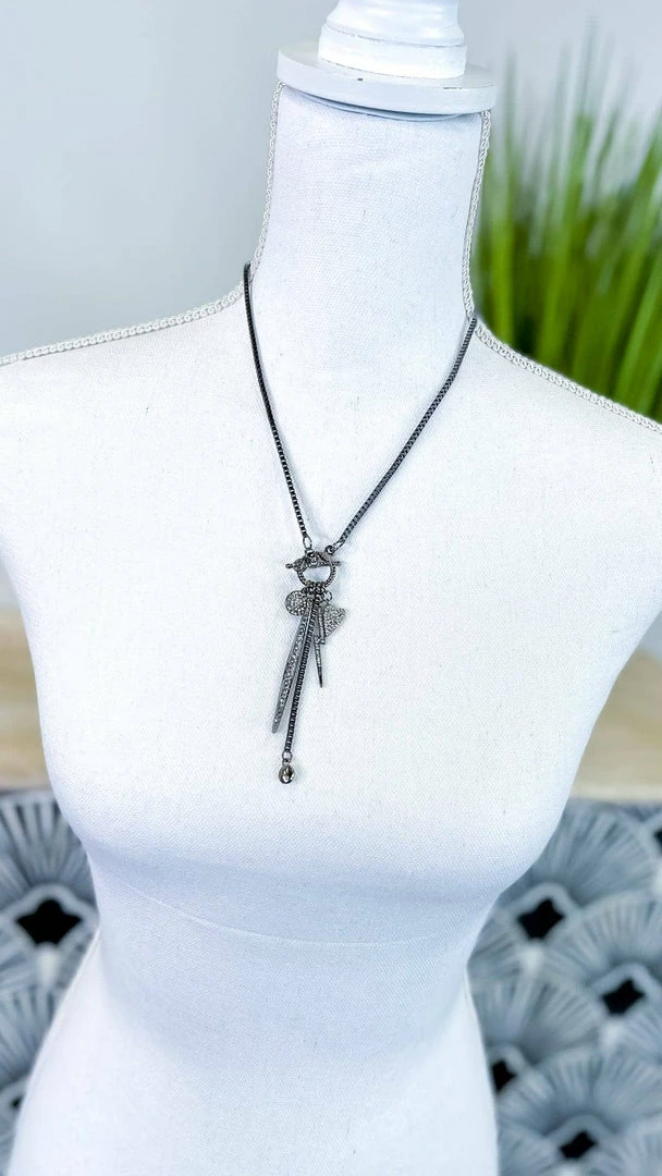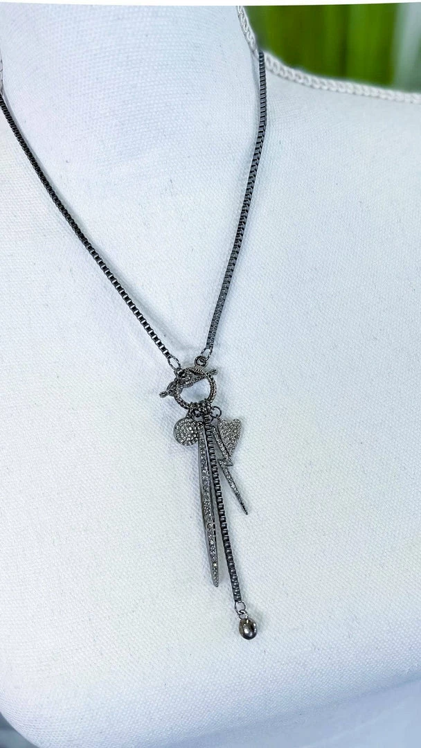 This charming necklace is the perfect accessory for any outfit. The Merissa Necklace features a cross pendant and various charms dangling from a long, delicate chain. With its unique design, this necklace is sure to add a touch of personality to any outfit.