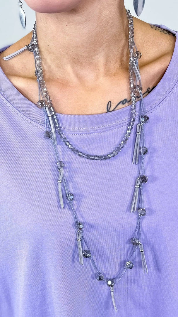 The perfect touch of bohemian glam. A little bit gypsy, a little bit rock and roll, this necklace is a true statement piece. The long leather strand is adorned with beautifulΒ greyΒ beading, giving it a luxe and feminine look. The perfect finishing touch to any outfit, this necklace is a must-have for any fashion-savvy girl.