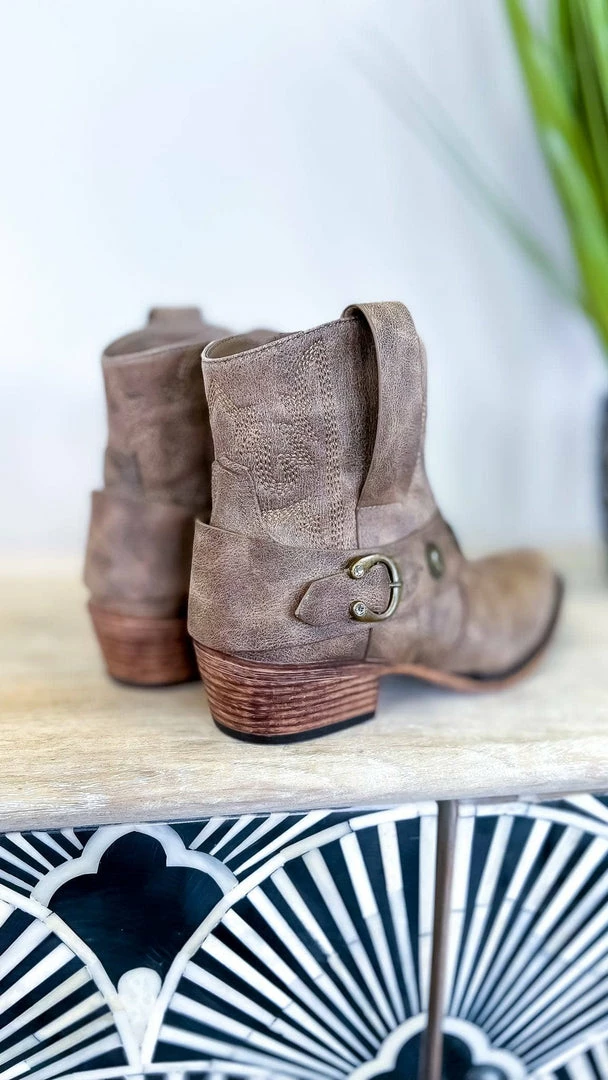 The perfect finishing touch to any outfit. With a versatile taupe color and western-inspired design, these booties are perfect for styling any look. From a day at the office to a night on the town, these booties will have you stepping out in style. With a cushioned insole and stylish buckle detail, these booties will keep you comfortable all day long.
