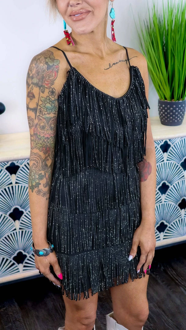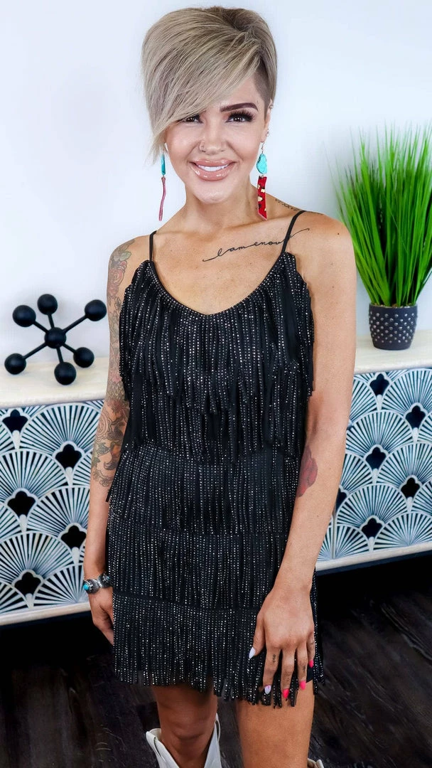 Sequins shine and fringe swaysβyou are the star of the show in this Balcony Dancing Dress. With a figure-flattering silhouette, this black fringe dress will have you looking and feeling your best. The sequin fringe dress moves with you as you dance the night away, catching everyone’s eye as you strut your stuff. Whether you’re shaking it on the dance floor or stealing the show on the balcony, this is the dress for making an entrance.