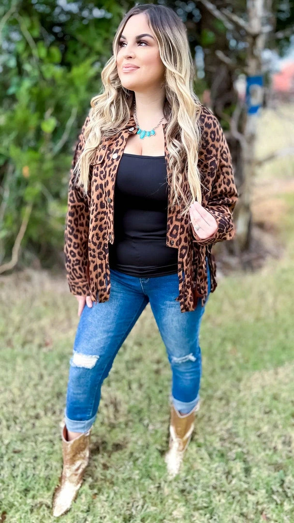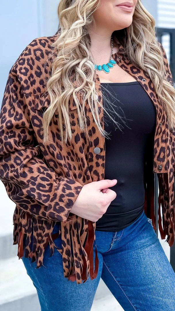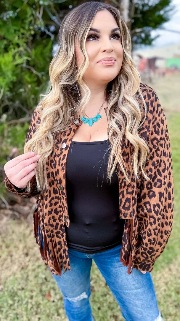 Add a touch of wild to your look with this fierce jacket. With its stylish leopard print and touch of fringe, this jacket will have you turning heads all night long. Perfect for a night out on the town, this jacket will keep you warm and looking sharp.