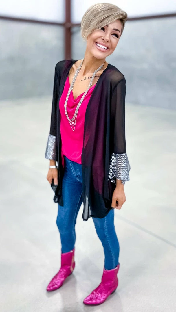 This Black Step Above Simple Cardigan is perfect for adding a touch of glamor to any outfit. With sequin detail on the cuff and sleeves, this cardigan will make you stand out from the crowd. The black mesh material is perfect for creating a sleek and sophisticated look, whilst the cardigan style ensures you stay comfortable and stylish all day long.