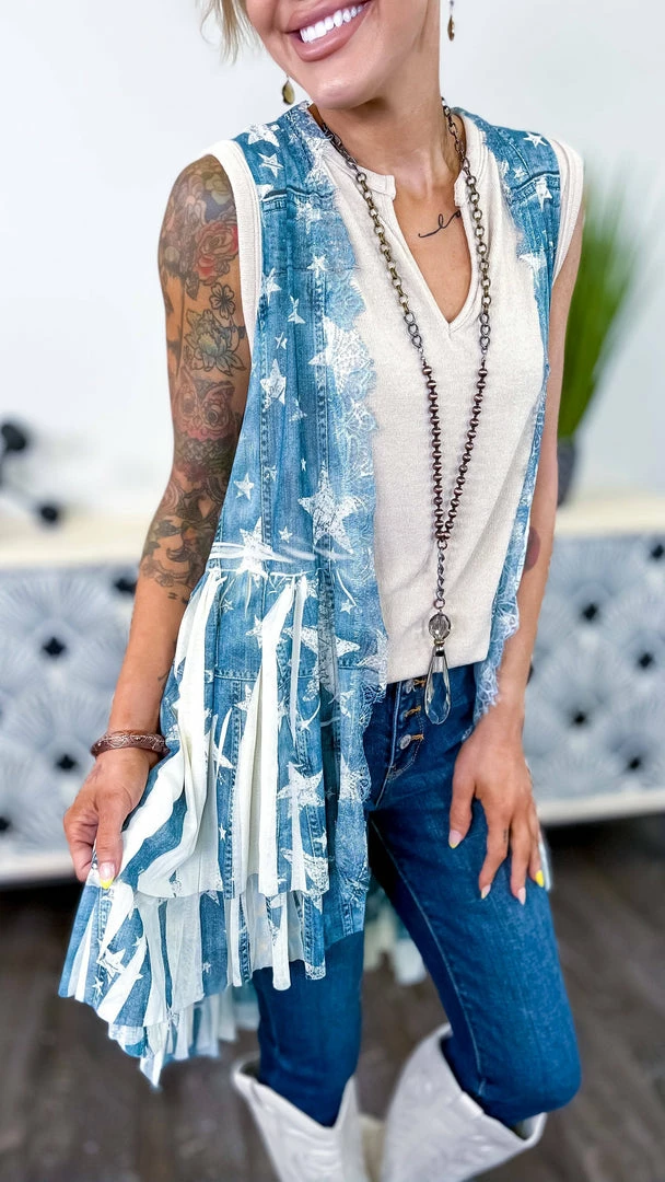 Who said stars only belong in the sky? Our Denim Star Stood Alone Vest will make you shine. With a unique denim and star print, this vest will add some fun to your look. Dress it up or down, this vest is perfect for any occasion.