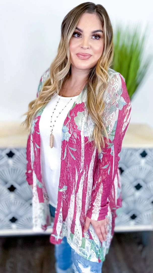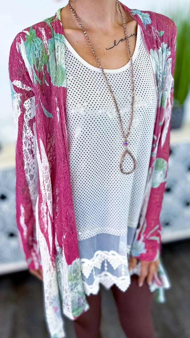 This beautiful cardigan will have your heart skipping a beat. Made with intricate lace detailing, this cardigan is perfect for dressing up or down. We love the pretty floral print and versatile long length. Style this cardigan with a dress for a special occasion or wear it with jeans for a casual day out. No matter how you wear it, you’ll love the heart-stopping look.