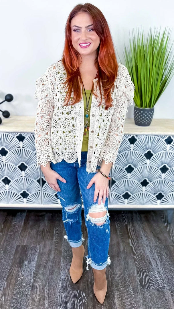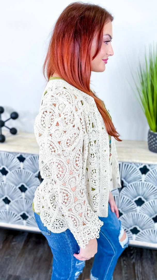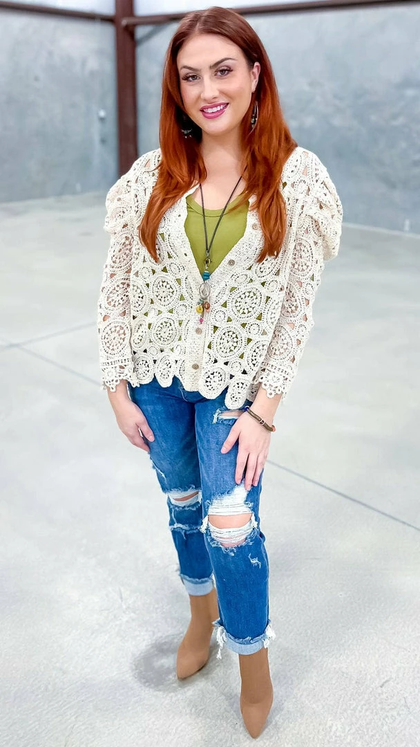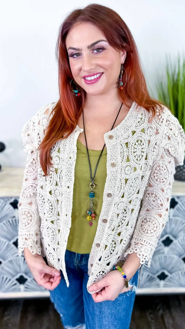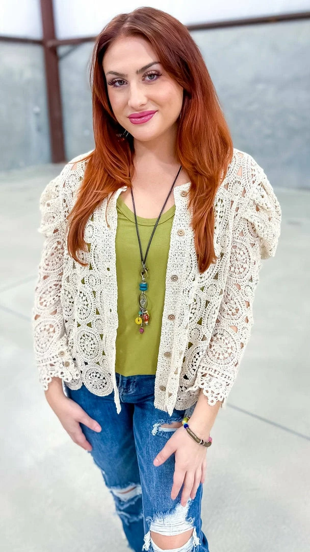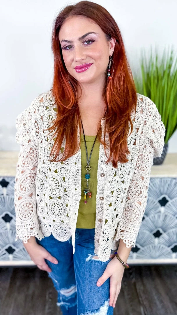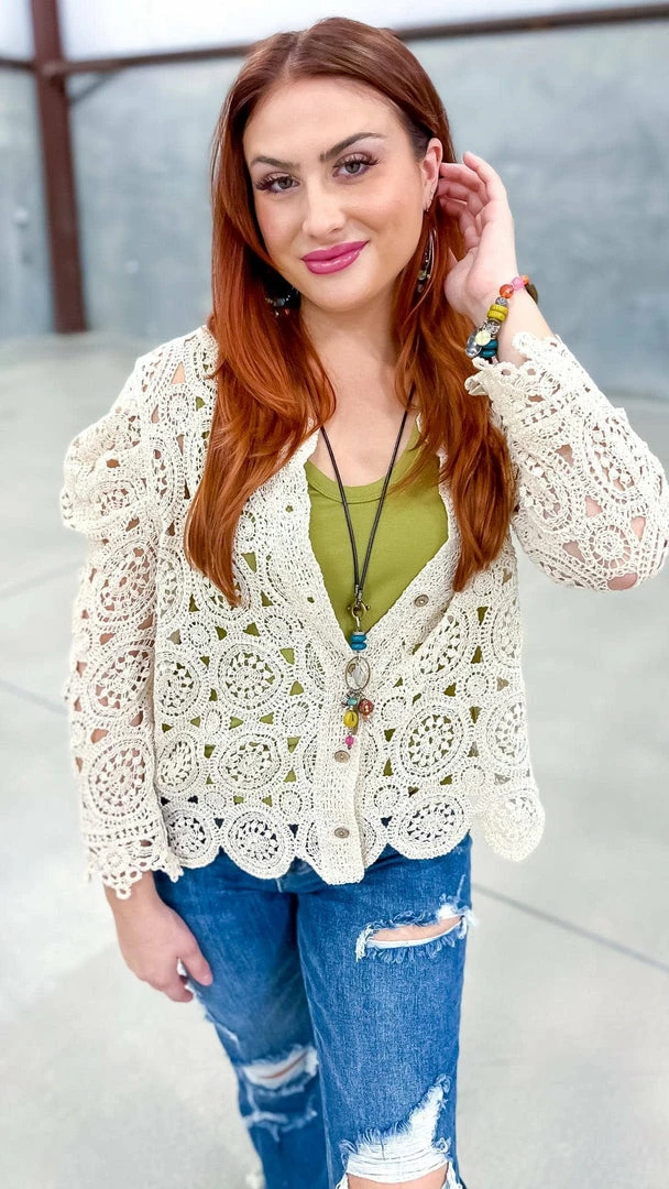 The Natural Gentle Beauty Cardigan is the perfect piece to take your outfit from pretty to polished. This crochet cardigan features a button-down front and long sleeves, making it the perfect layering piece. The natural color is versatile and flattering, and the crochet detail adds a touch of femininity. Whether you’re dressing up for work or having brunch with friends, this cardigan will help you look your best.
