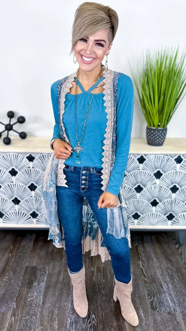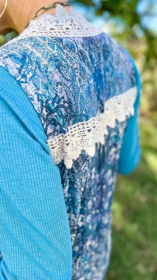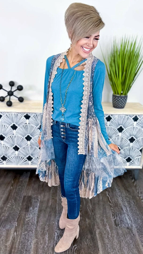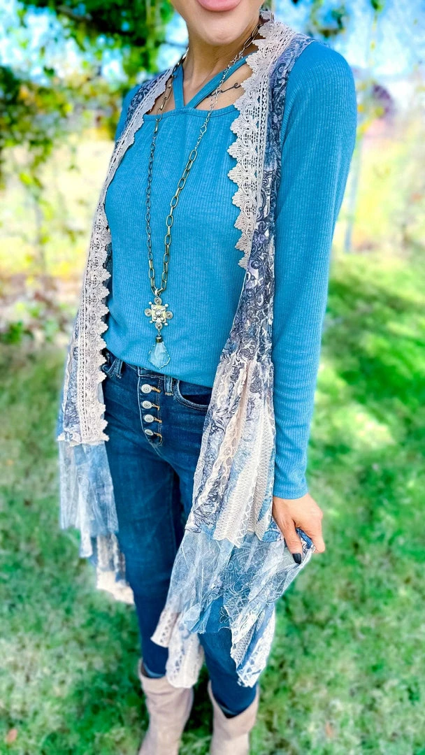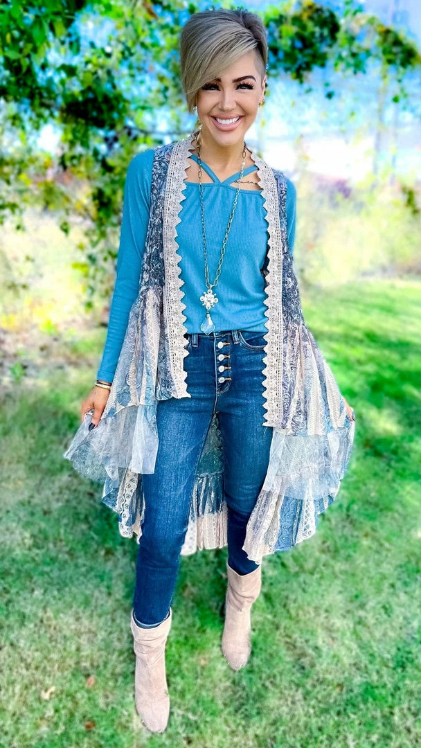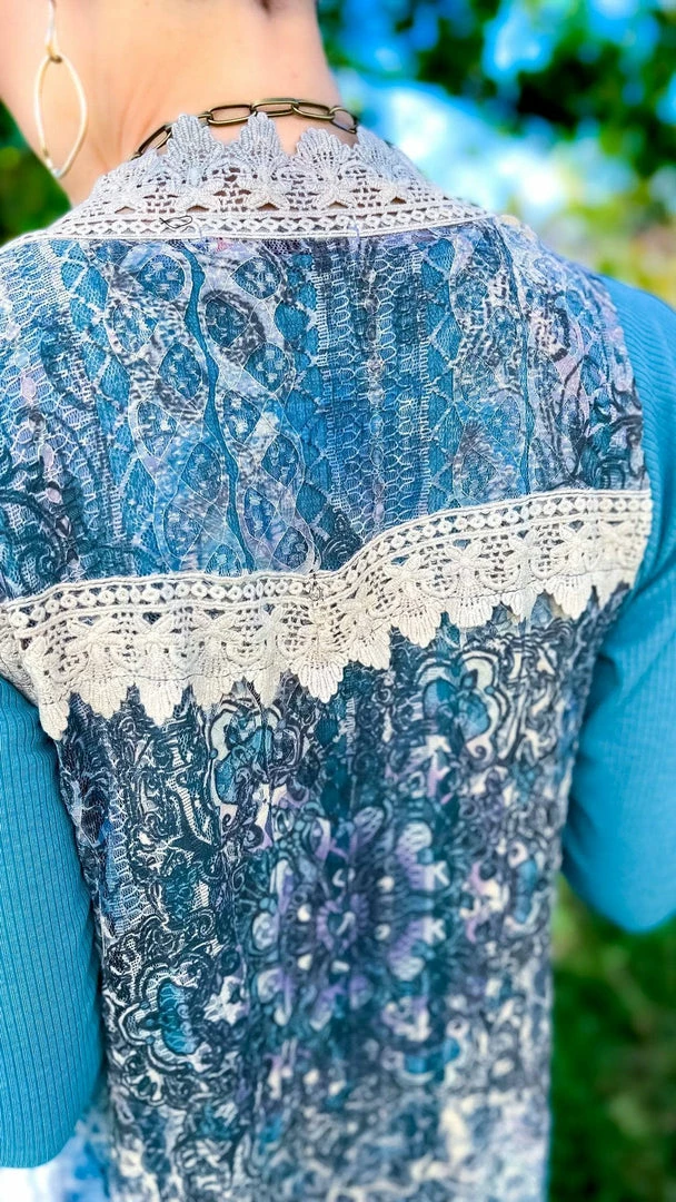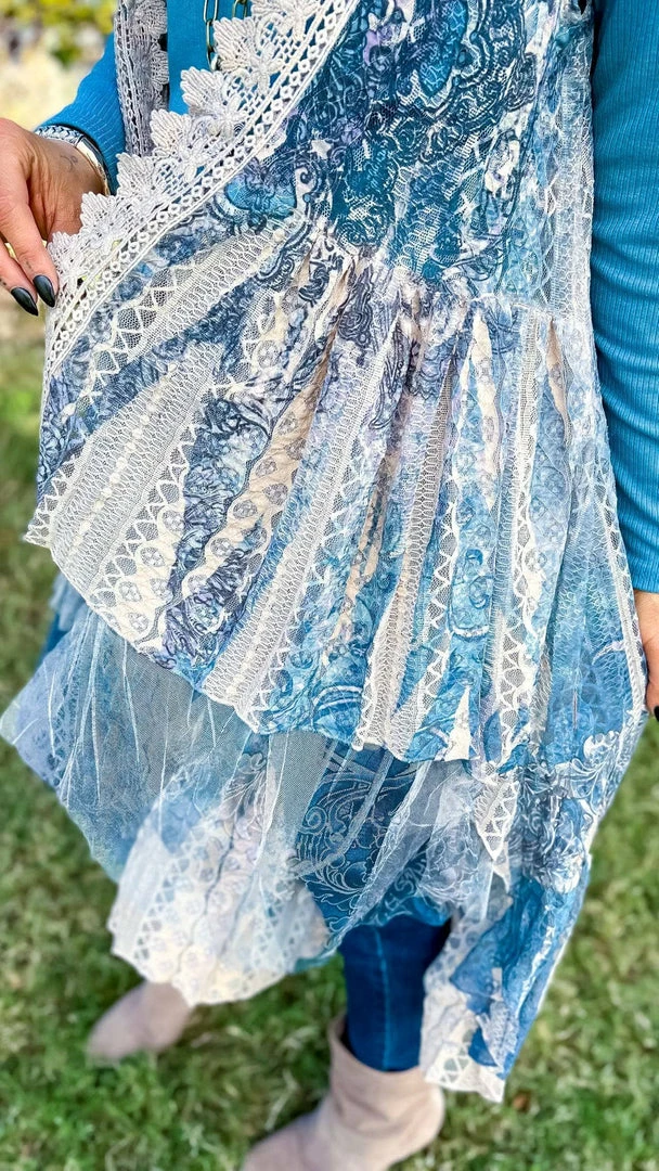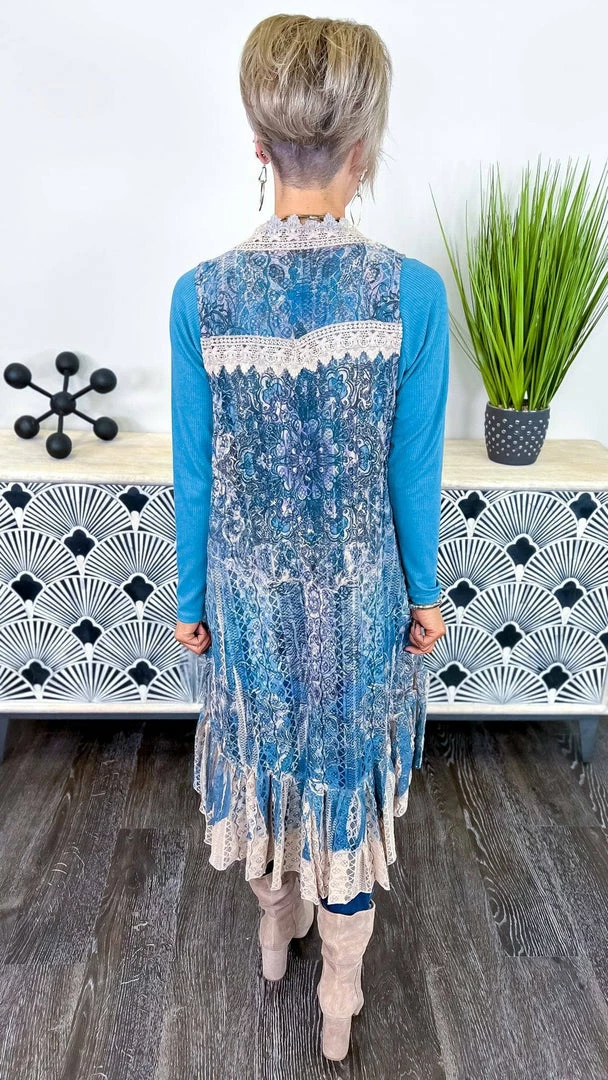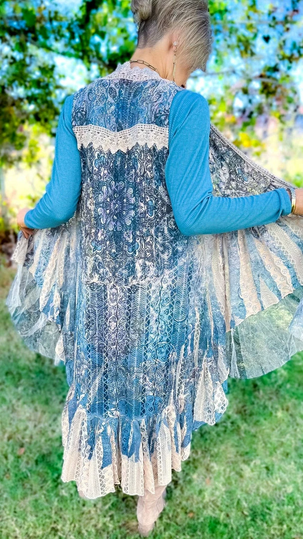 This gorgeous vest will make you want to move!Β Beautiful boho print on a sheer fabric with multiple layers. Amazing taupe and navy colors throughout. So cute over a dress or your top and distressedΒ jeans!