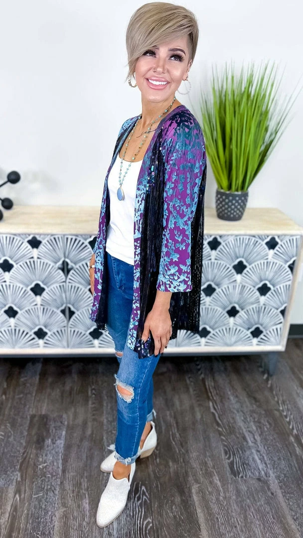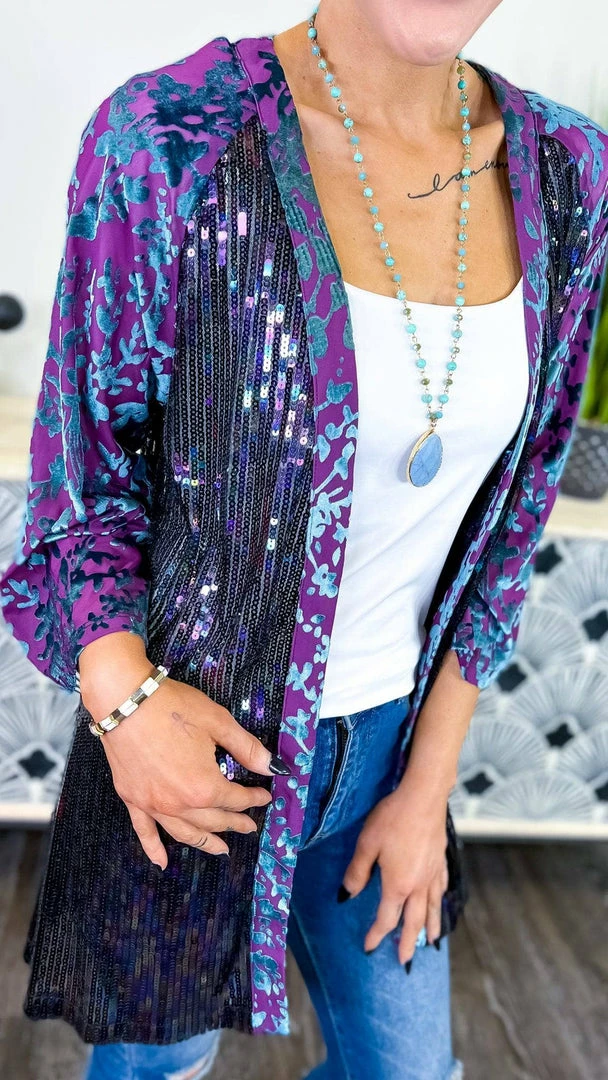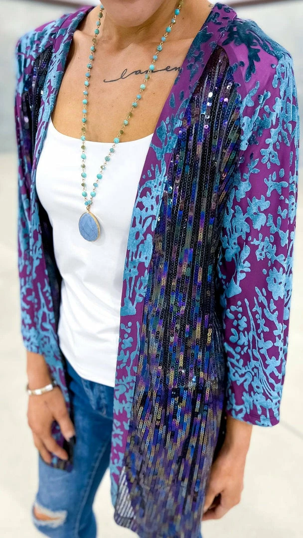You’re a VIP. Now everyone will know it. This luxurious cardigan says it all. With rich velvet and dazzling sequin details, this layer will make you feel like a total goddess. Perfect for dressing up or down, this cardigan is a must-have for your wardrobe. Add it to your wish list and prepare to make someone’s day.