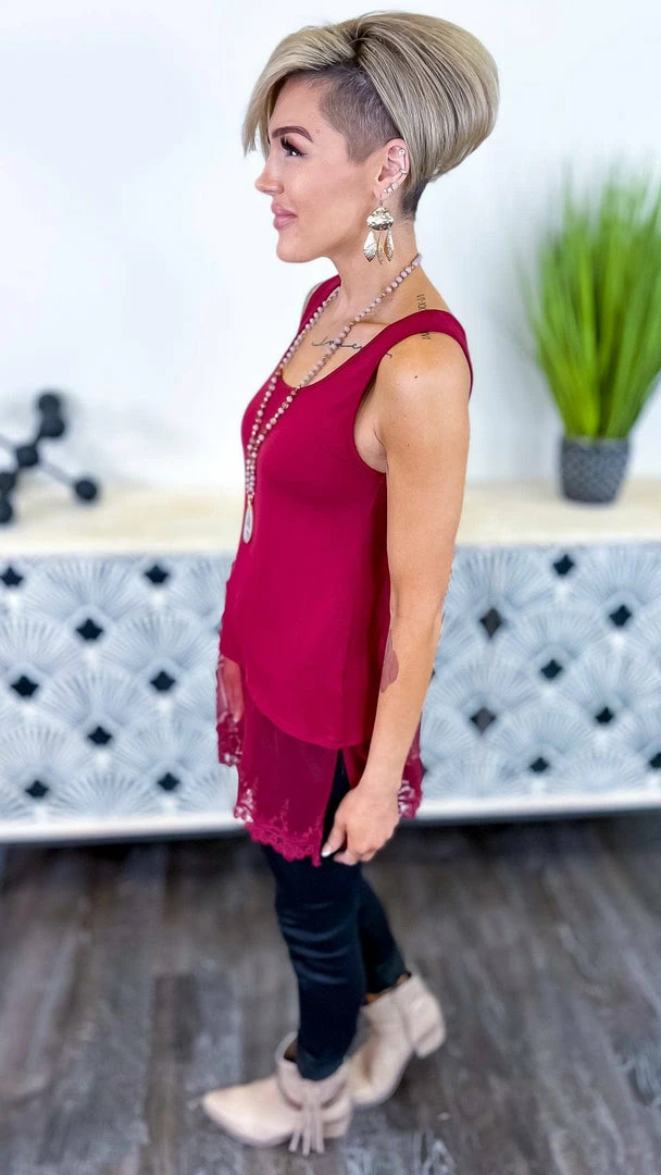 You’re going to want to be seen in this tank. With a wine hue and delicate lace print, this sleeveless tank is perfect for a day or night out. It’s also lightweight and airy, making it the perfect travel companion. You’ll love the way this tank makes you feel. Sophisticated and sexy, it’s a must-have for your wardrobe.