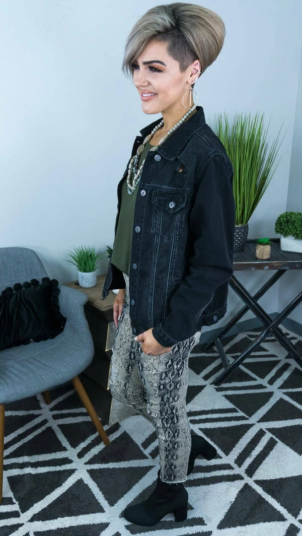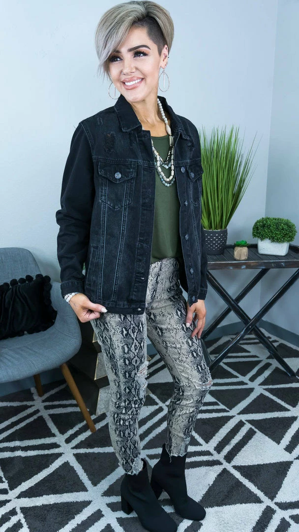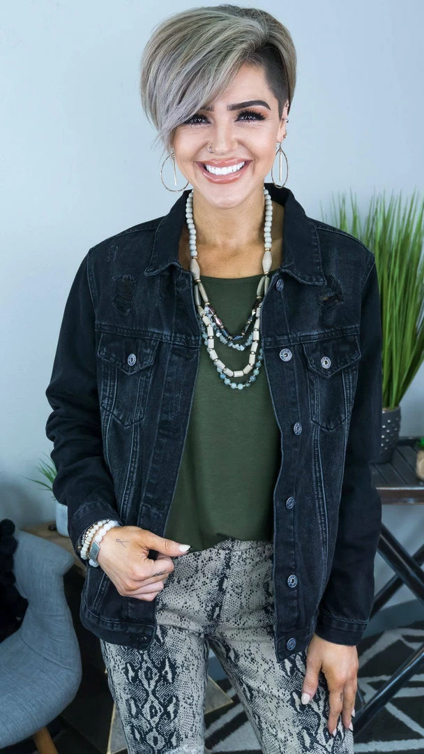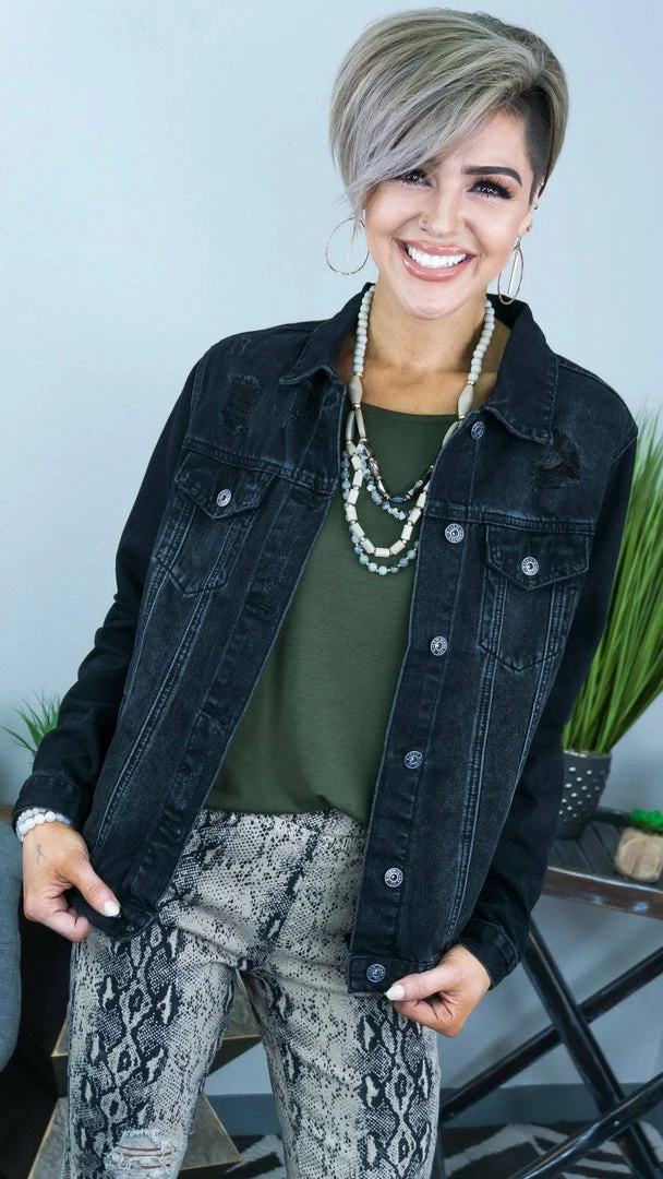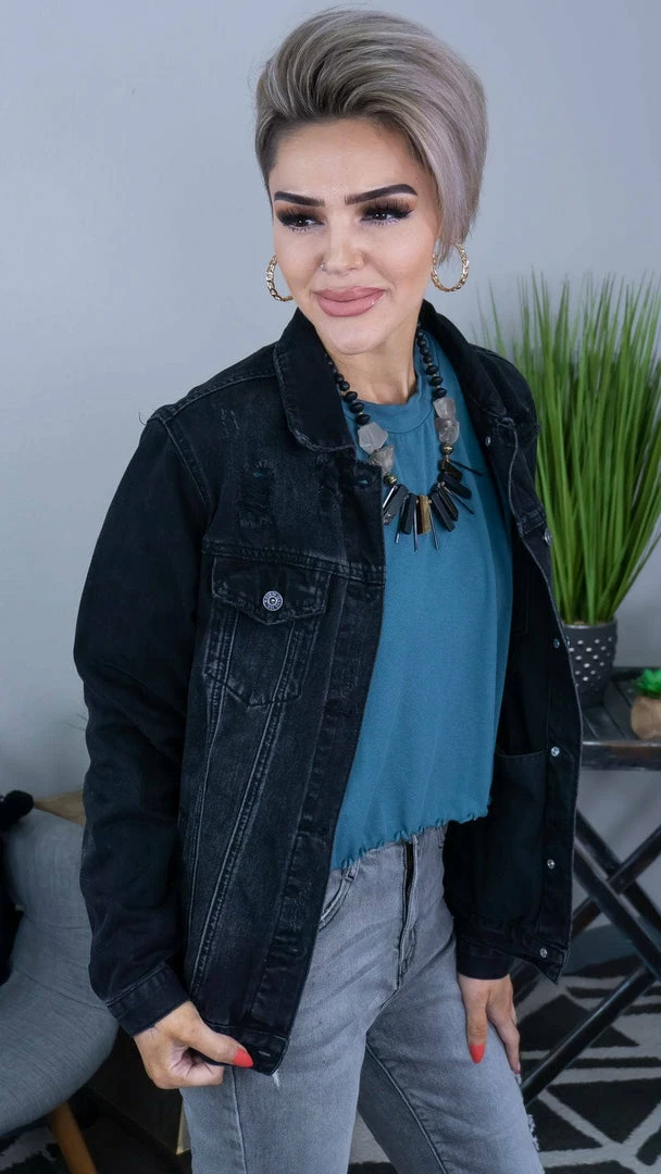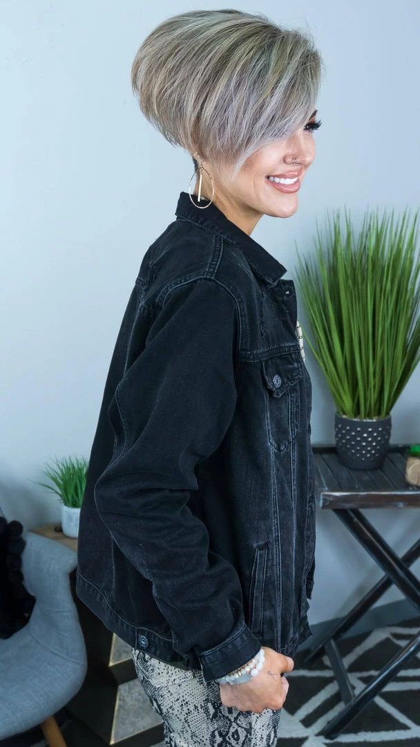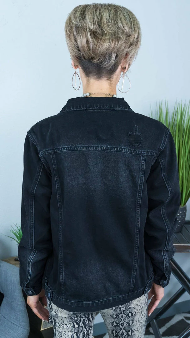This black denim jacket is the ultimate closet staple. Grab one today to layer over any outfit!Β