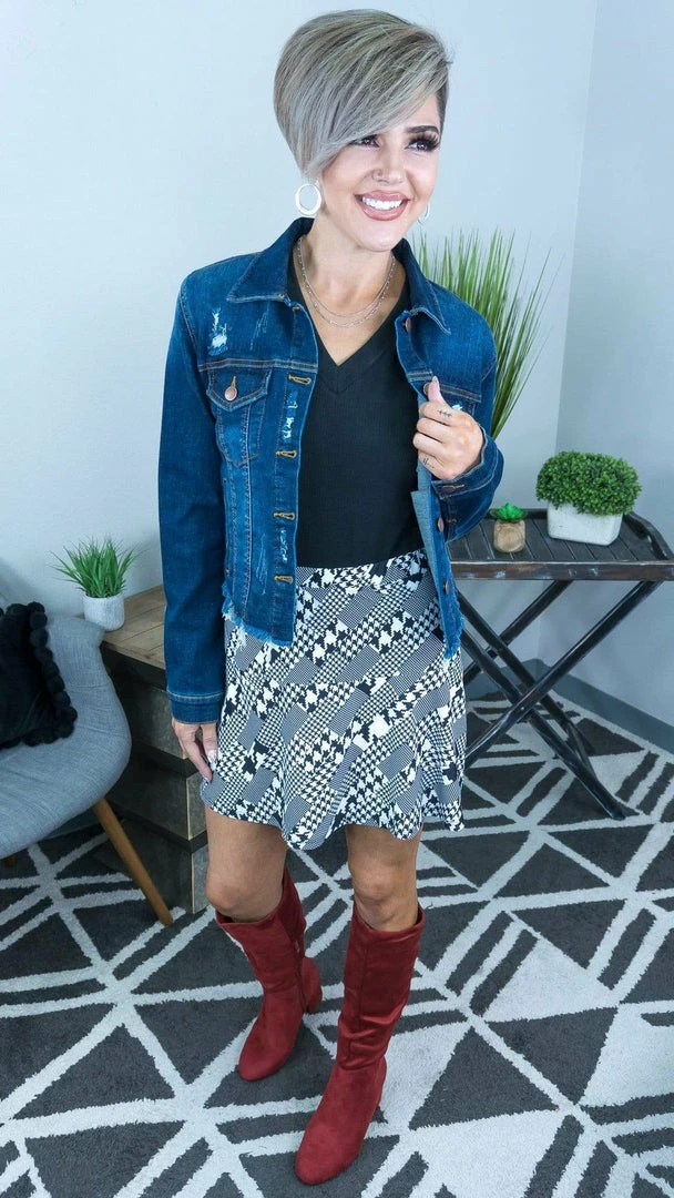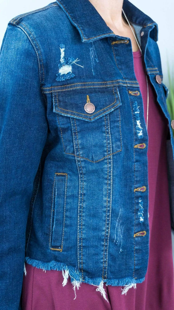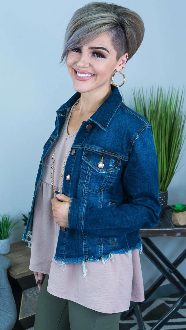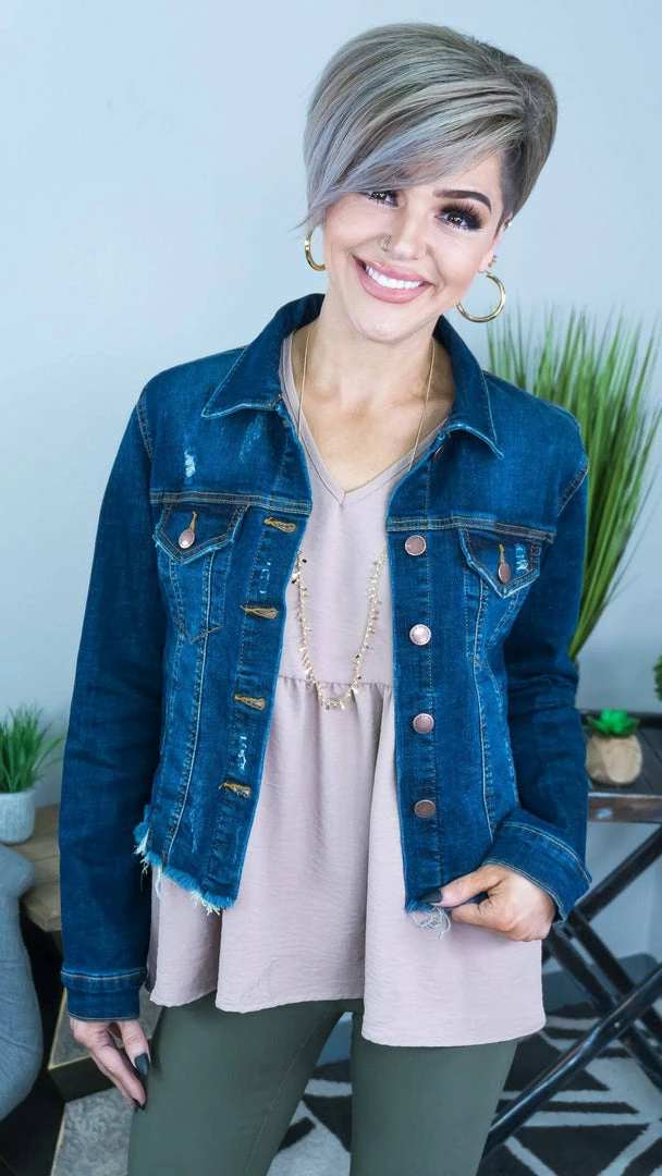 We have a new denim jacket, and it is cuuuuuute. Darker wash with a frayed hem and a great length. Total perfection!Β