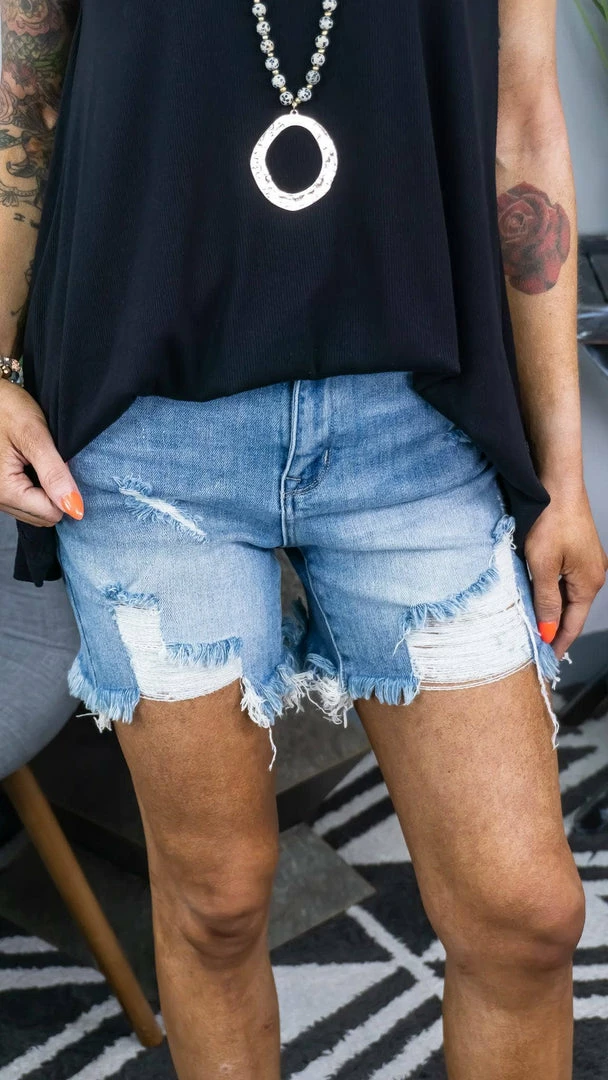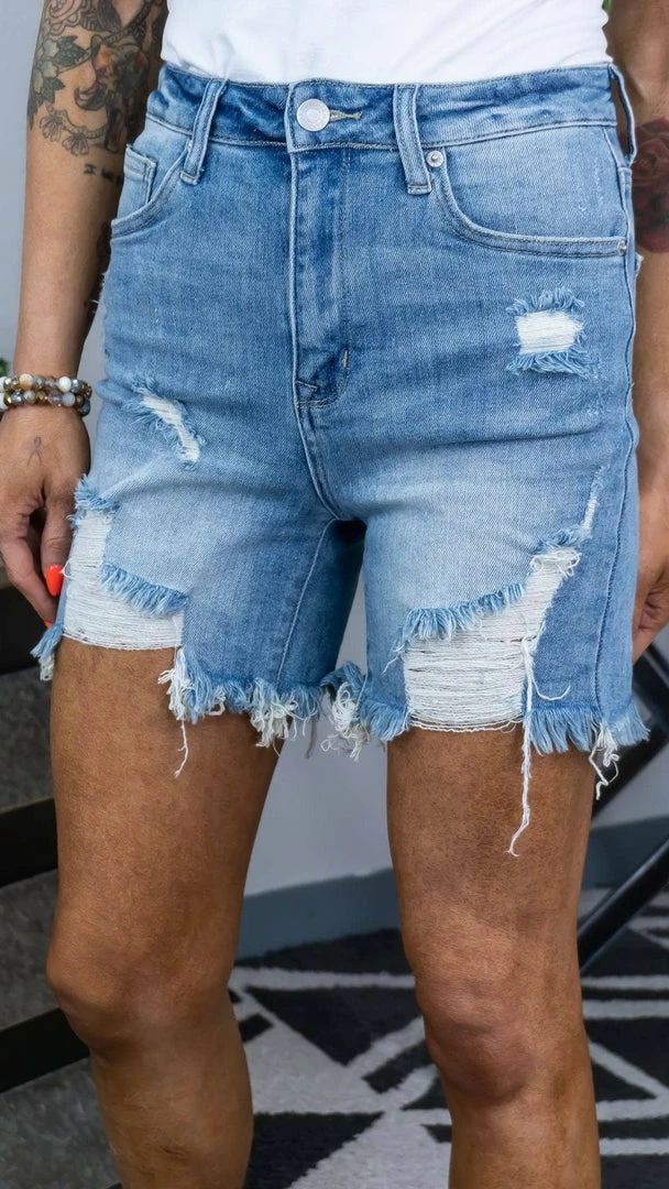Style: High Rise Distressed Mid Thigh Shorts