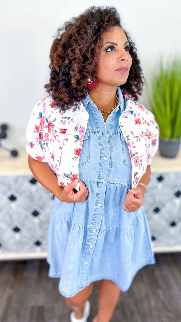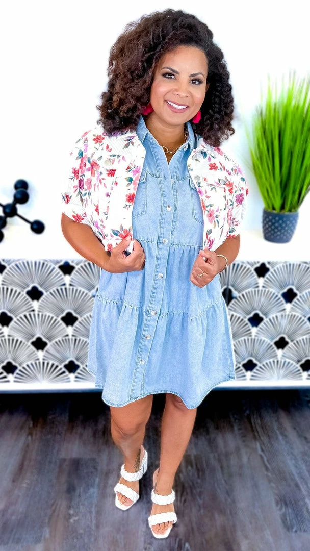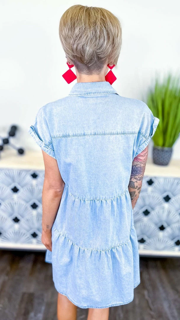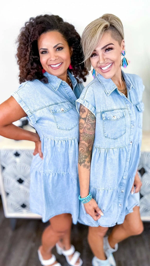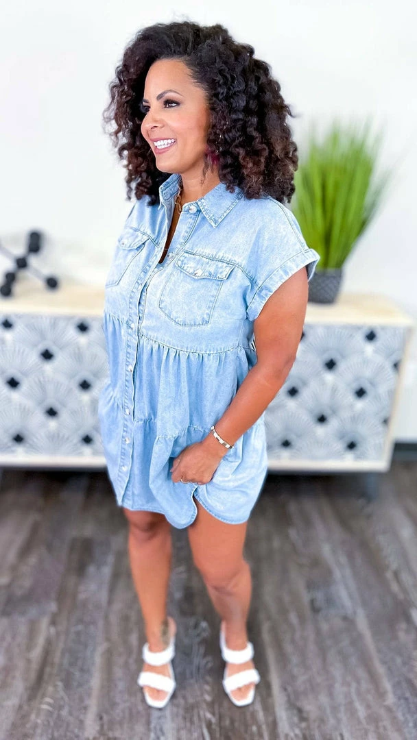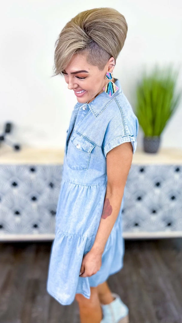 Everyone needs the perfect brunch dress, and this one is it! Featuring a light wash denim fabric, collard neckline, short dolman sleeves, a tiered bodice, and two front chest pockets.ο»Ώ Throw on a pair of white or light brown boots and you’re brunch ready!Β
