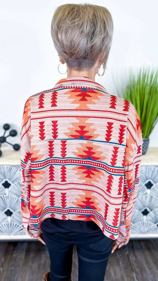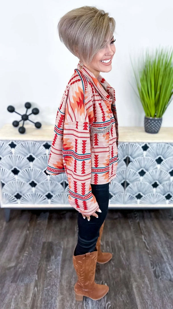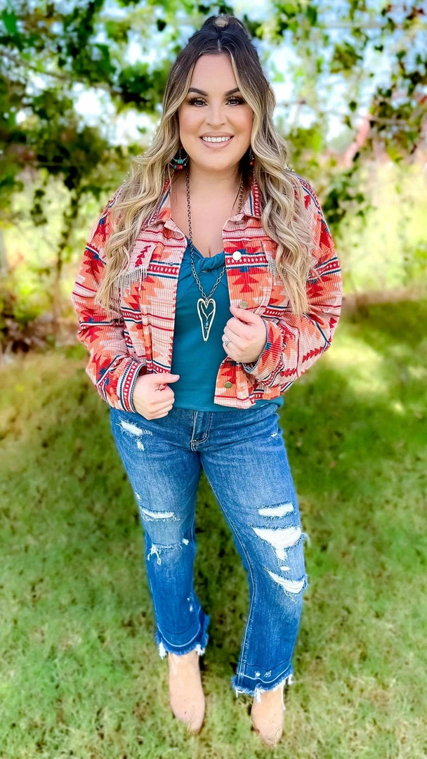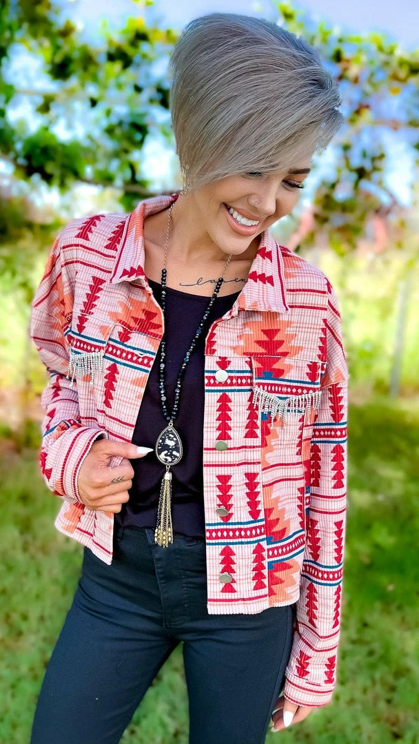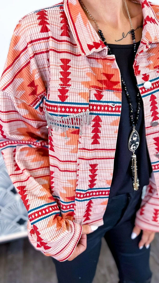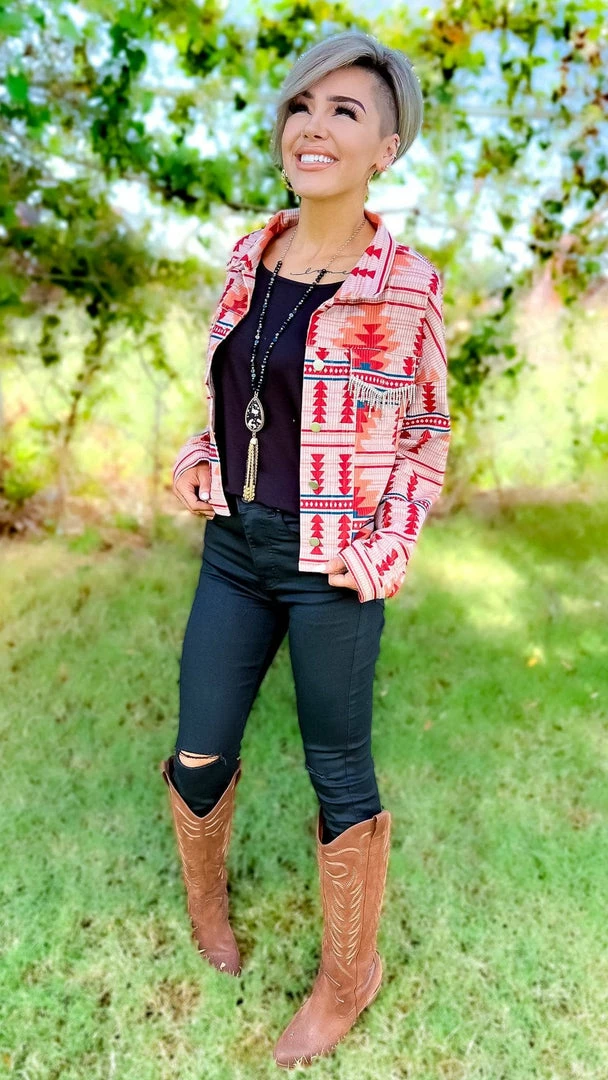 Add some edge to your wardrobe with this Fashionable Scene Jacket. The aztec print and rhinestone tassel trim give this jacket a stylish look that is perfect for a night out. The lightweight fabric makes this jacket perfect for layering. You’ll stay comfortable all night long in this fashionable jacket.