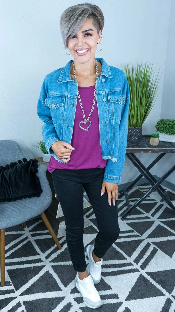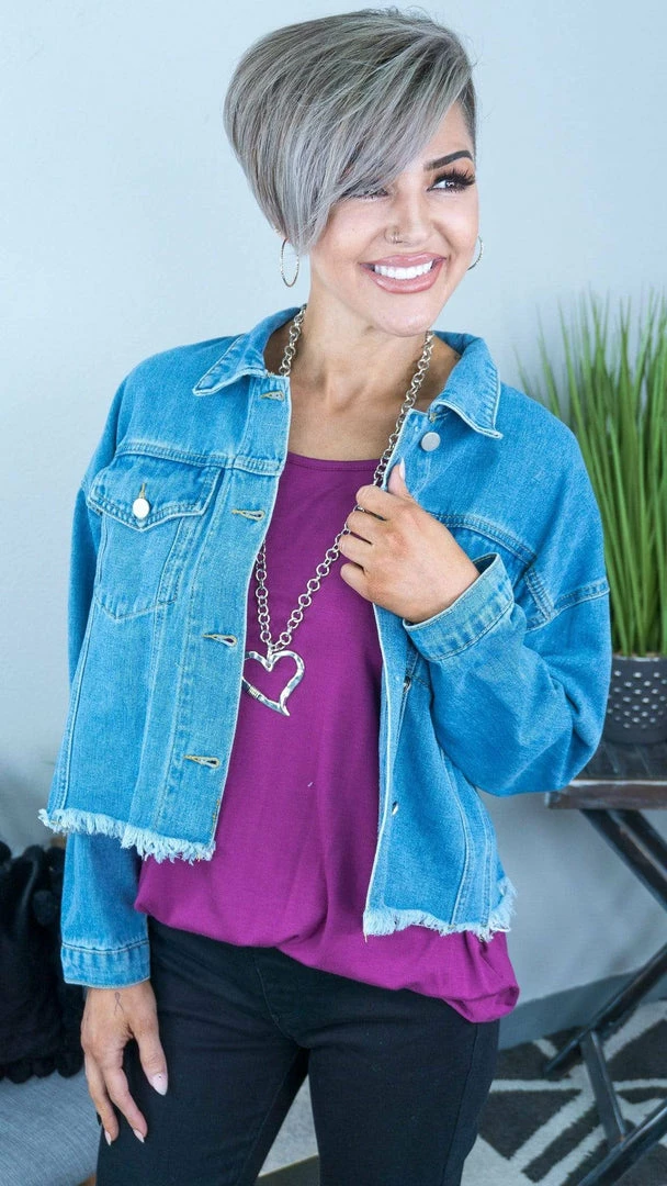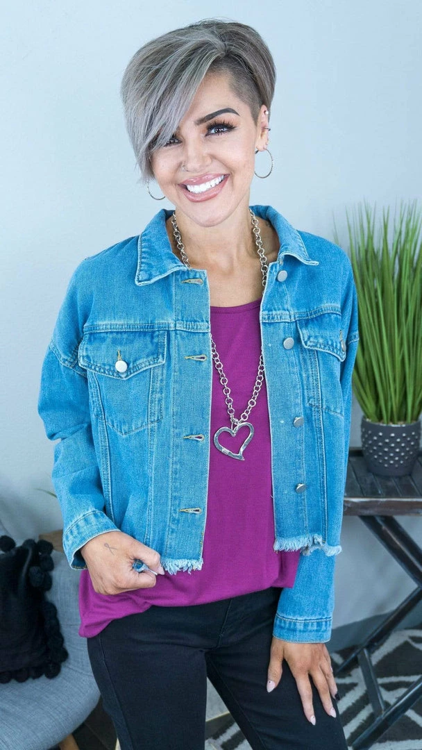 This denim jacket is anything but basic. Check out the raw hem & unique back!Β