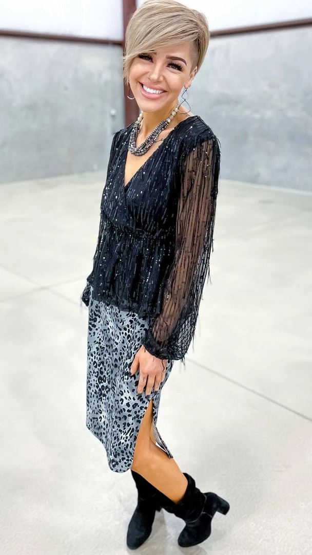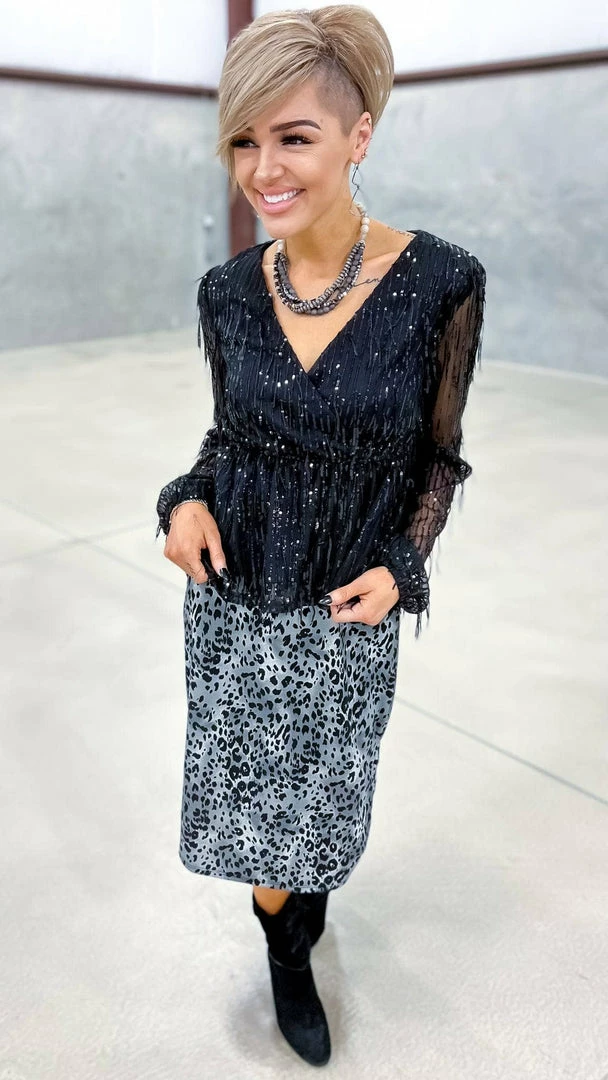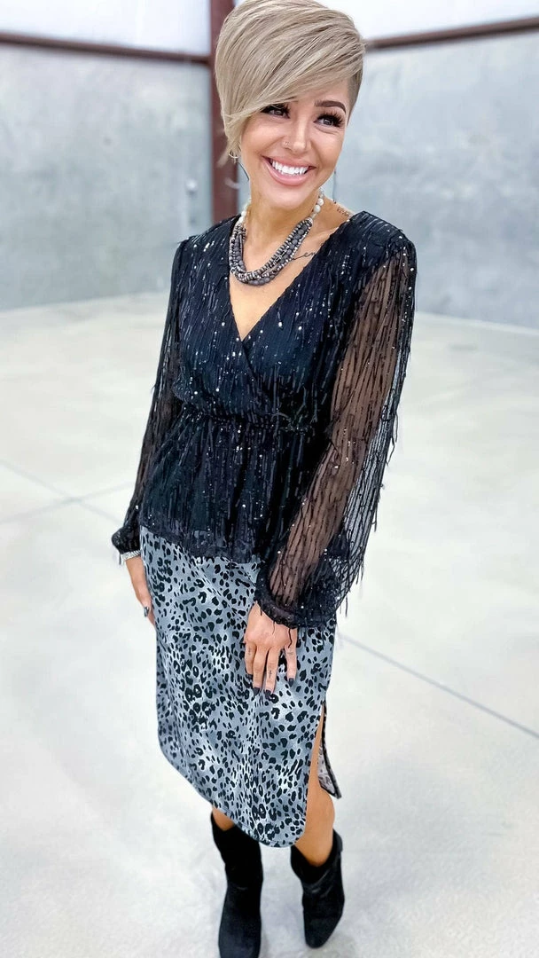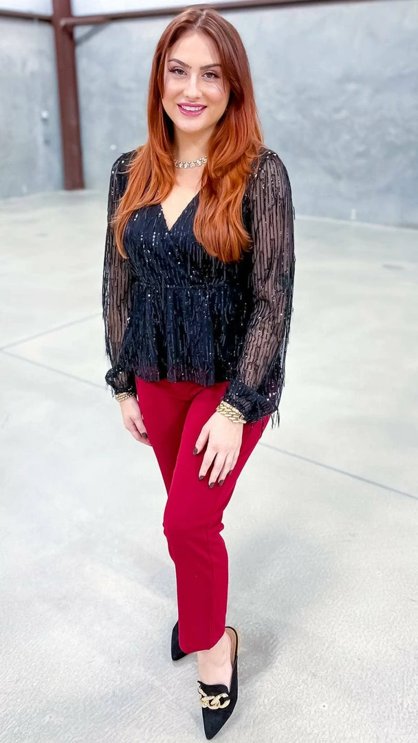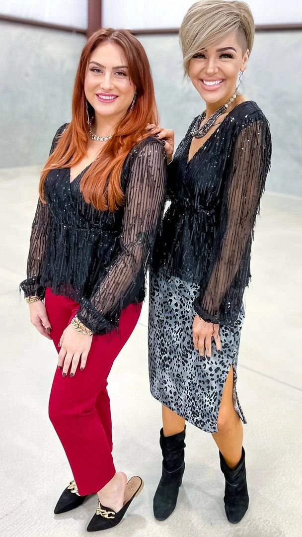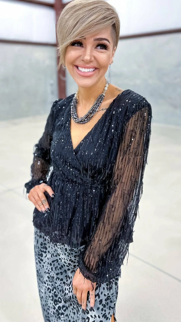 This top is sure to turn heads. TheΒ Black Glimmering Glow Top features sequins that shimmer and shine in the light. The long sleeves and v-neck top add a touch of elegance, while the peplum silhouette flatters the figure. Whether you’re headed to a party or a night out on the town, this top is sure to make you stand out.