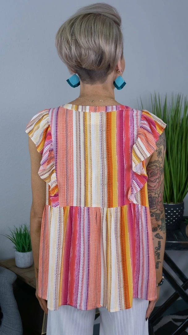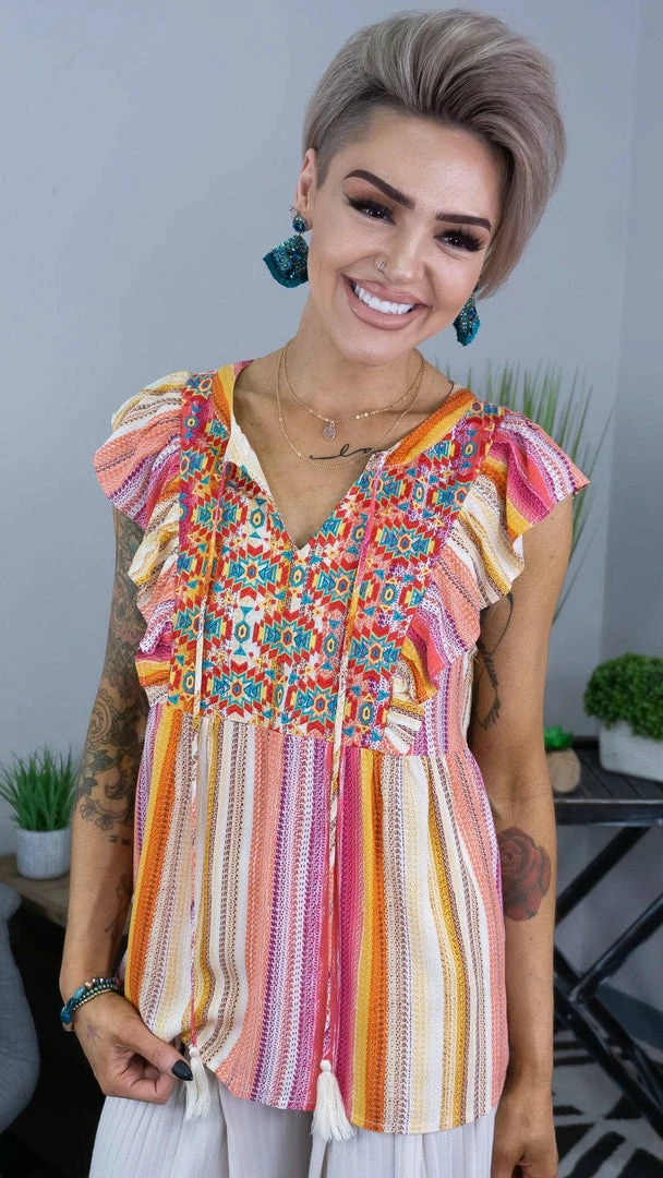 We’re coming in hot with this bright colored striped top featuring an intricate embroidery,Β flutter sleeves, and relaxed fit.Β