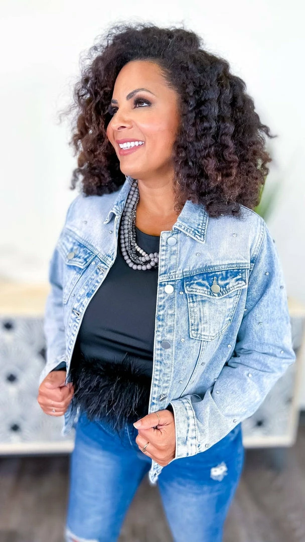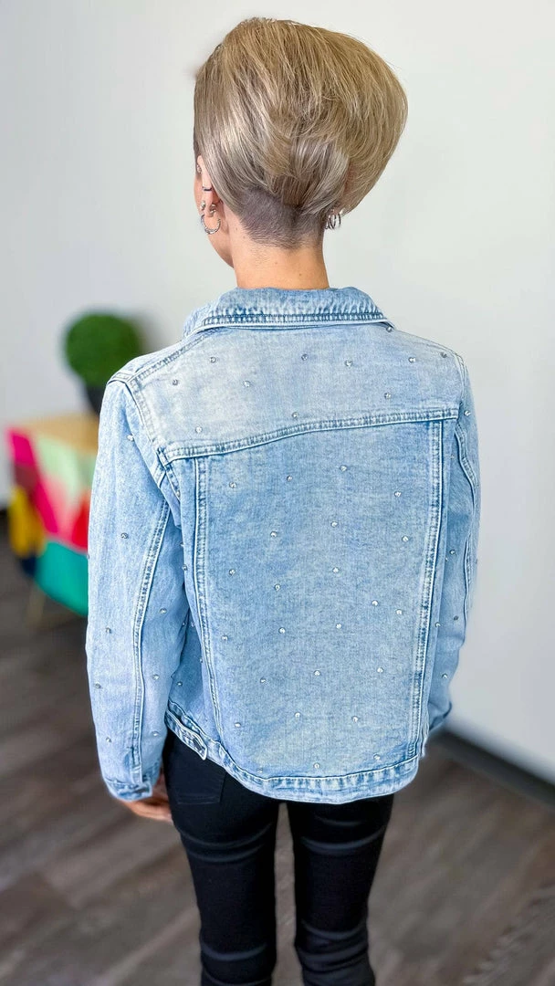 Add a little edge to your style with this Totally Studding Denim Jacket. A denim jacket is a key layering piece and this one takes it up a notch with edgy studded details. It’s perfect for dressing up or down any look. With a versatile style that can go from a day at school to a night out, this jacket is a must-have in your wardrobe.