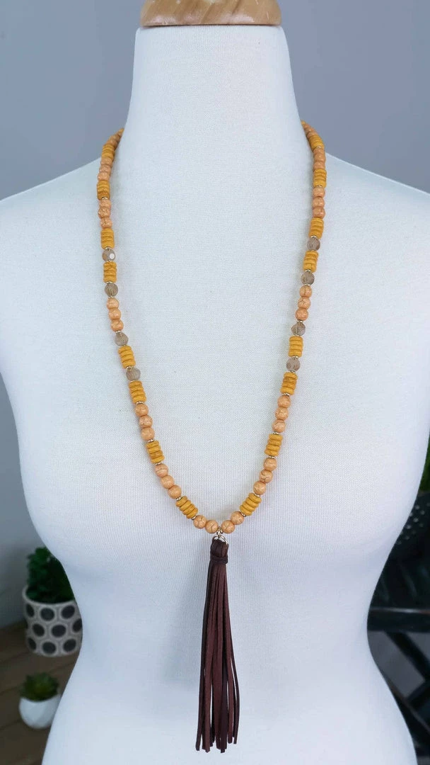 Pull out your small town gal vibes with this beautiful mustard beaded necklace with a faux leather tassel.Β