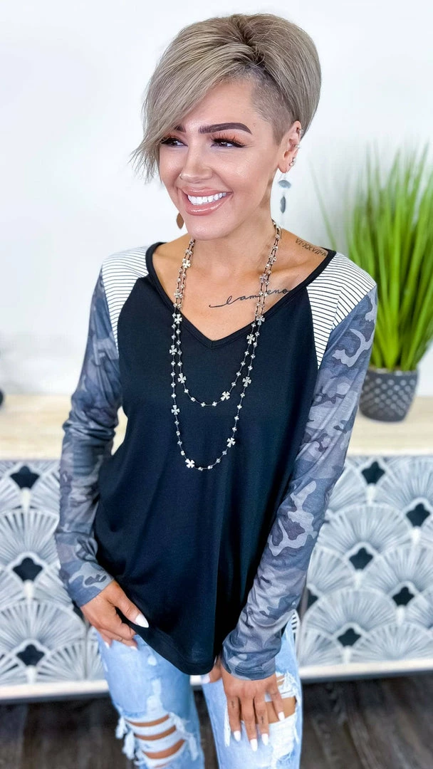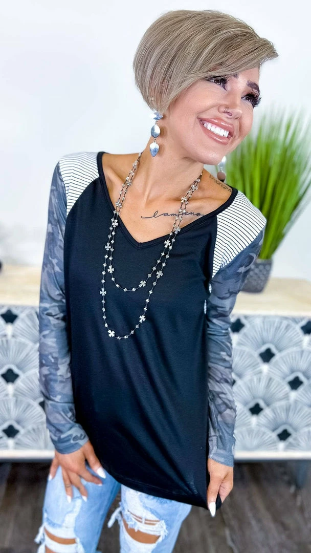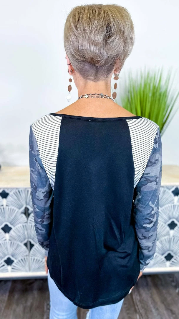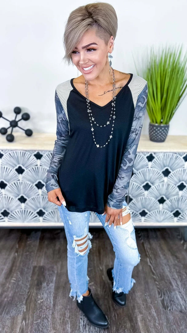 You’re a force to be reckoned withβand this top proves it. Show the world what you’re made of in our Camo I Will Survive Top. With a fun camo sleeve and stripe detail, this top will help you feel strong and stylish at the same time.