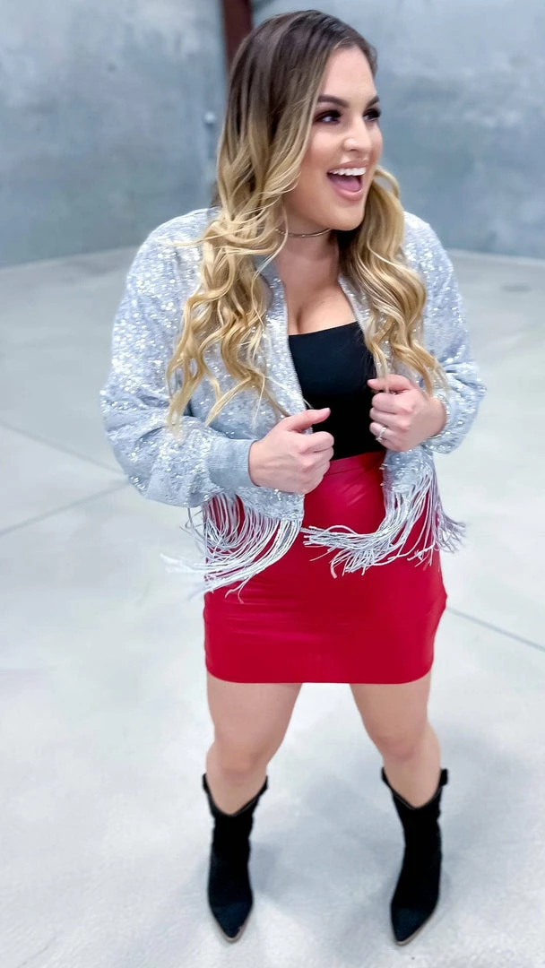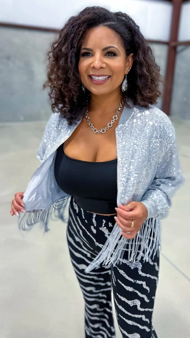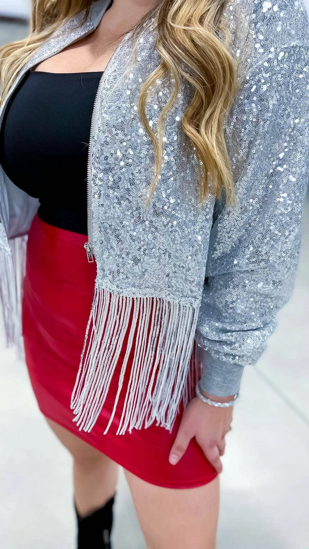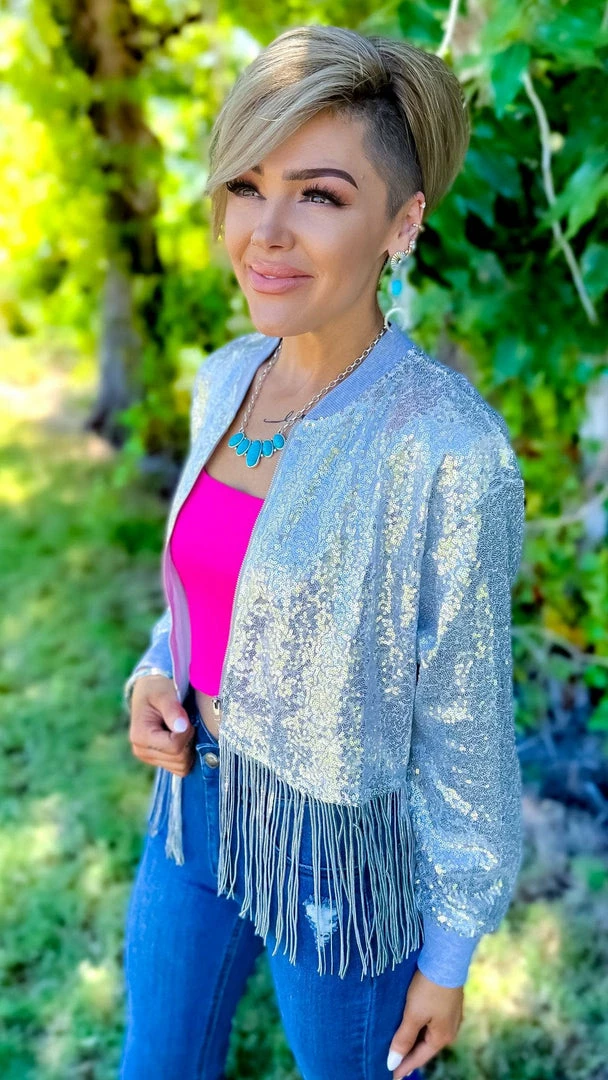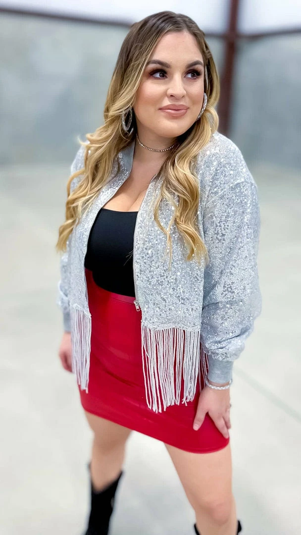 Step into the spotlight with this Silver Dancin’ Queen Jacket. With fringe detailing and sequins that shimmer and shine, you’ll be sure to turn heads when you walk into the room. Whether you’re hitting the town or just out for a night on the dance floor, this jacket is sure to make you feel like the queen you are.