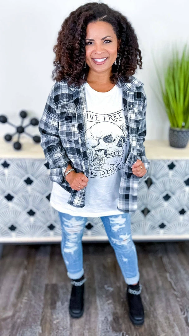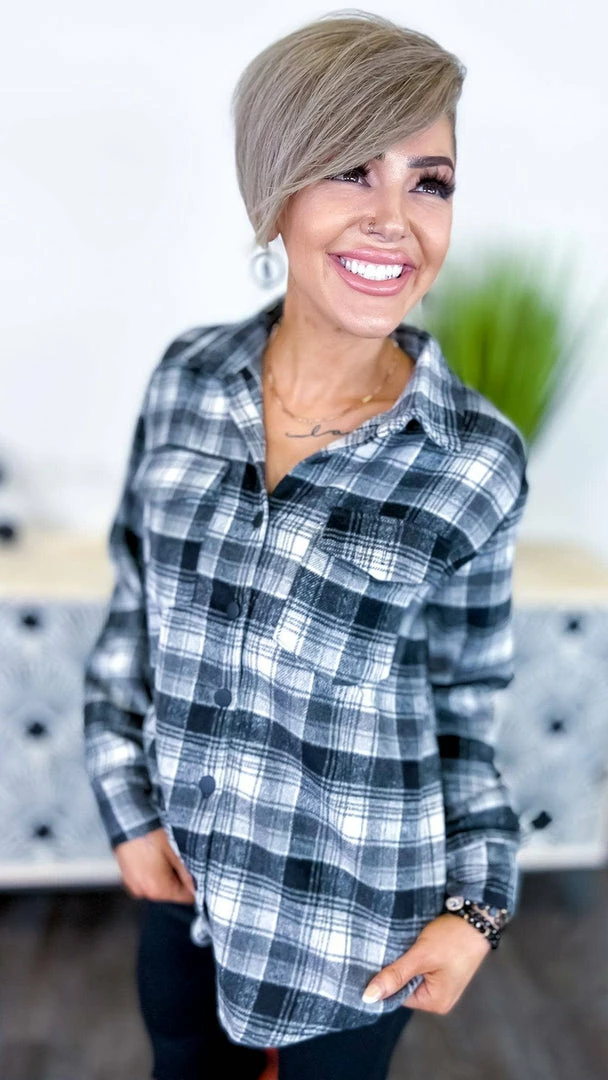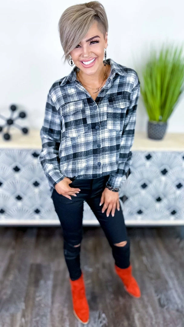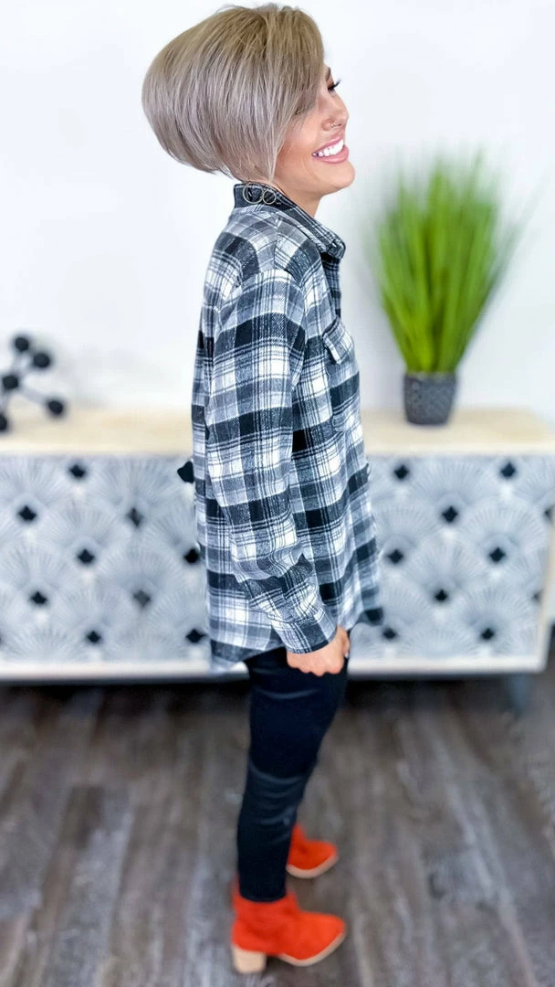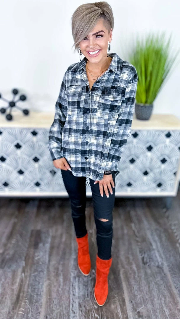 The Silent Movie Shacket has arrived just in time for your favorite season. This shacket is perfect for layering on those cool autumn days. The black plaid design is timeless and classic, while the front chest pocket adds a touch of utility. The long sleeves will keep you warm all day long. Throw it on over your favorite flannel for a cozy look that will have you feeling silent movie star chic.