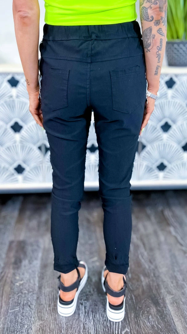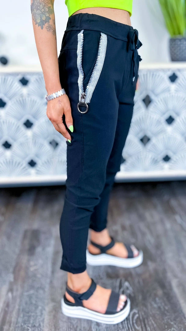 These pants are too chic for school! With their trendy black color and comfortable fit, these jogger pants are perfect for any casual day. The side zippers and crystal details add a touch of luxury, making these pants perfect for a fun day or night out with friends. Dress up or down these pants to fit any style.