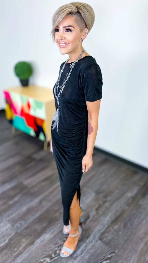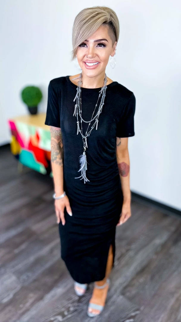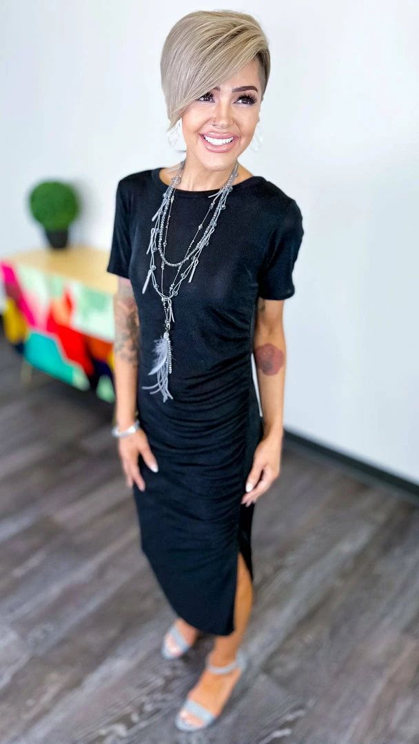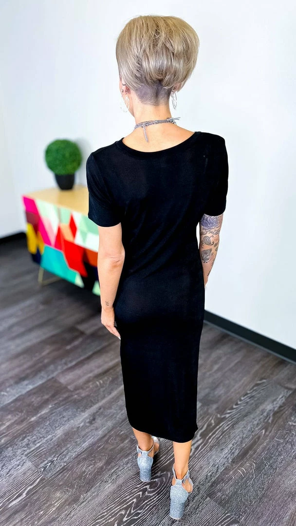 The ZigZag Stripe’sΒ Black Dancing Alone Dress is the perfect way to show off your moves–and your style. ThisΒ black midi dress features aΒ unique side ruching that gives this dress an extra special touch makingΒ you feel beautiful and confident whether you’re shaking it on the dance floor or walking into a meeting. The luxurious fabric is lightweight and breathable, making it comfortable to wear all day long. Plus, the chicΒ black hue is perfect for any season. Add this dress to your wardrobe and get ready to dance the night away.