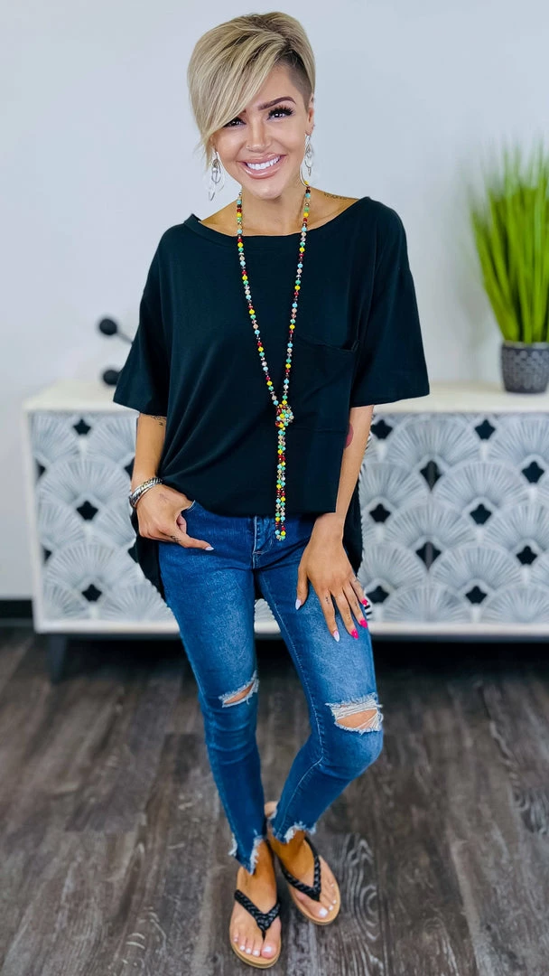 You’ll be longing to lounge in this ZZS top all day. The soft, black fabric and relaxed fit will make you never want to take this top off. With a front chest pocket, this top is perfect for a day of relaxation. Whether you’re staying in or hitting the town, this top is a must-have in your wardrobe.